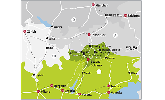 Route 1: über München › Innsbruck › Brenner › Bozen: Mehrmals täglich erreichst Du Südtirol ohne Umsteigen ab München. Die EC-Züge bringen Dich in weniger als vier Stunden über den Brenner.