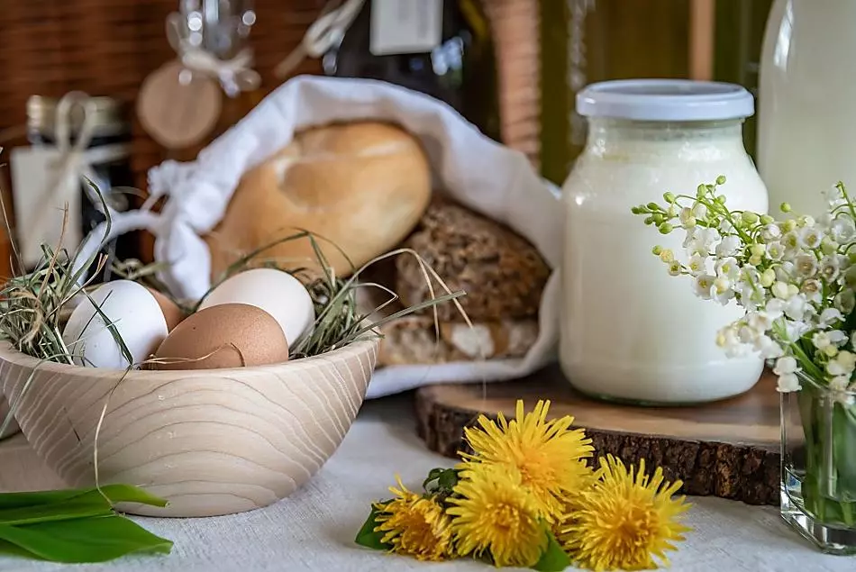 Milch, Eier, Fruchtsäfte, Gelees, Kräutertee ...