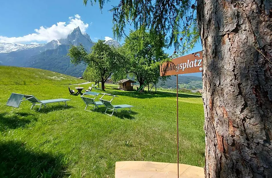 Die Hängeliege in der Streuobstwiese bietet großes Bergkino: der Schlern, so schön.