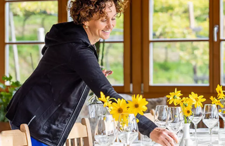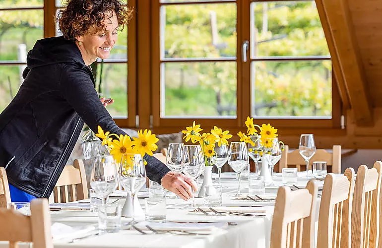 Familie Bracchetti ist bekannt dafür, sich an Neues heranzuwagen. Mutter Bruni versuchte sich im Buschenschank in der Küche und lernte mit den Jahren, was eine exzellente Köchin ausmacht. Auch Tochter Karin übernahm als Quereinsteigerin bald die Organisation des Hofes. War sie zuvor im Management als Angestellte tätig, setzt sie nun ihr Wissen und ihre Erfahrung ideal am Hof ein. Schnell etablierte sich Karin als Serviceverantwortliche und vertiefte ihr Wissen zum Wein.
