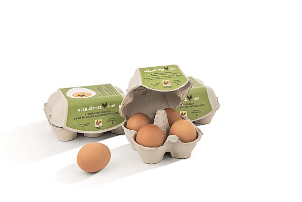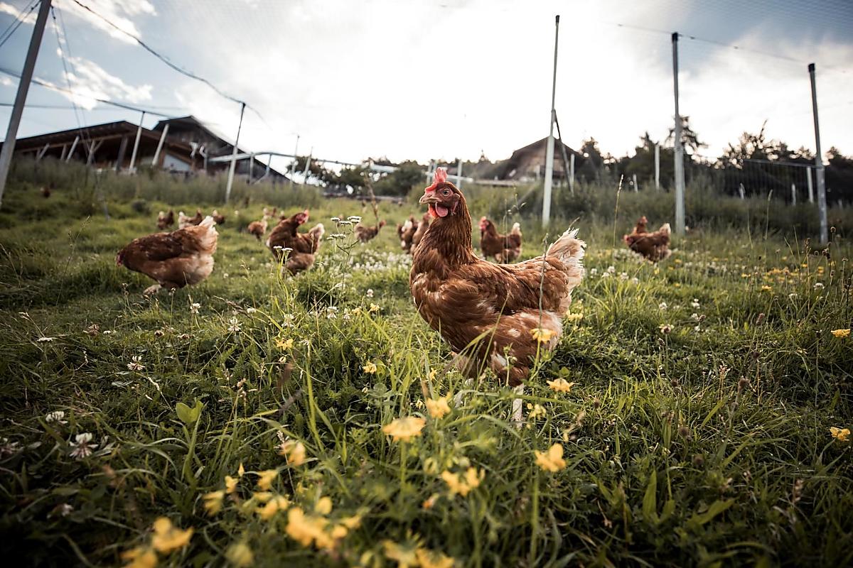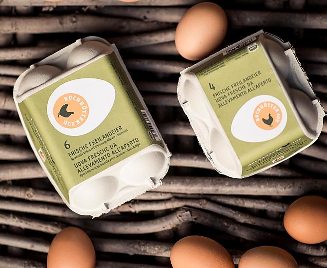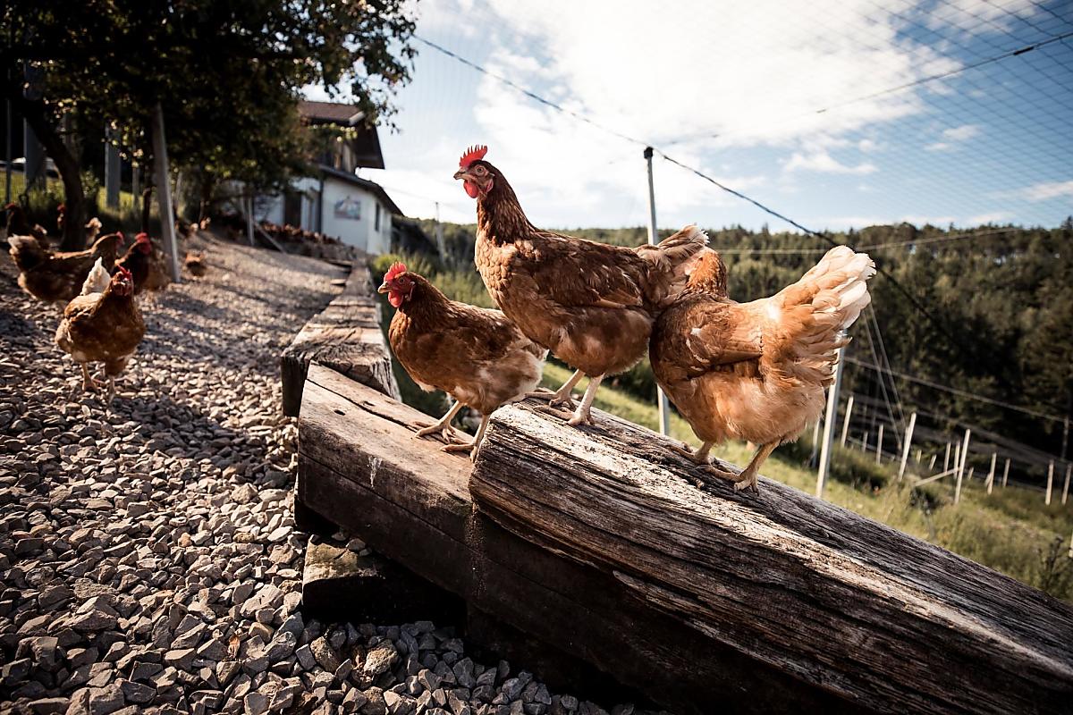 Für die am Buchhütterhof lebenden Hühner stehen 3 große Ställe mit viel Auslauf im Freien bereit. Das Freigehege umfasst zwei kleine Seen, Wiesen und Sträucher. Hölzerne Tipis und überdachte Flächen spenden den Hühnern Schatten. Nachts und bei schlechtem Wetter ziehen sie sich in die gut belüfteten und angenehm beheizten Ställe zurück. Zu fressen bekommen sie gentechnikfreies Futter mit einer Extraportion Kräuter. Die natürliche Mischung aus getrockneten Kräutern und Gewürzen stellt Thomas Messner selbst her. Sie verleiht den Eiern vom Buchhütterhof einen leichten, frischen Kräutergeschmack. Die Wirkstoffe der Heilpflanzen halten zudem die Hühner gesund.