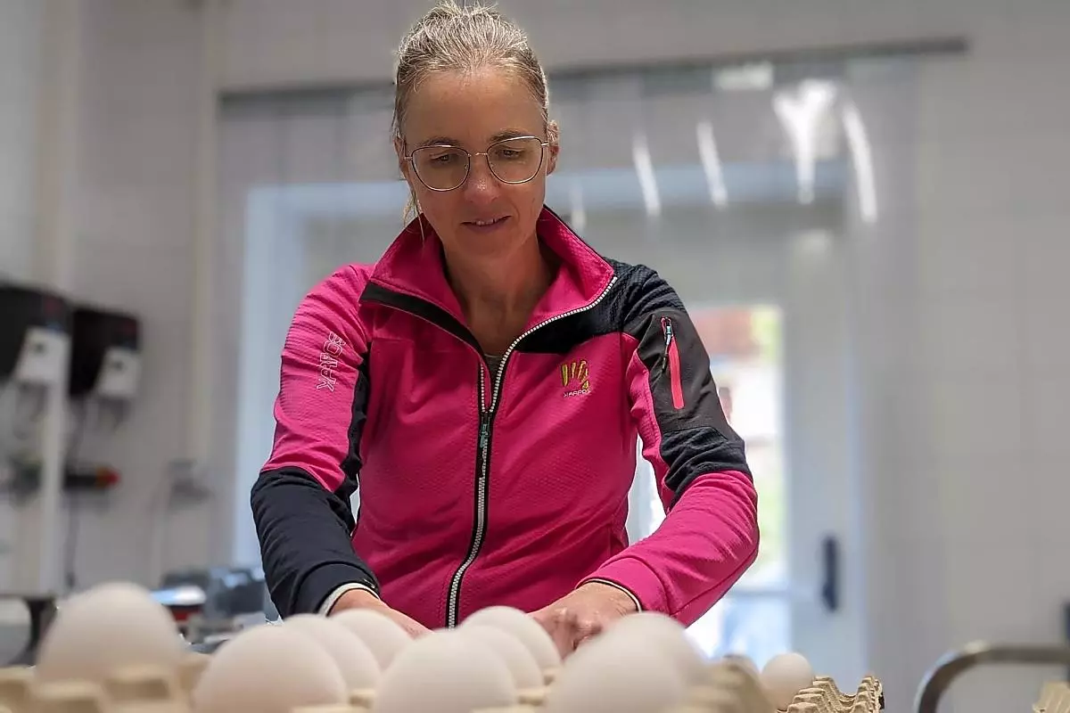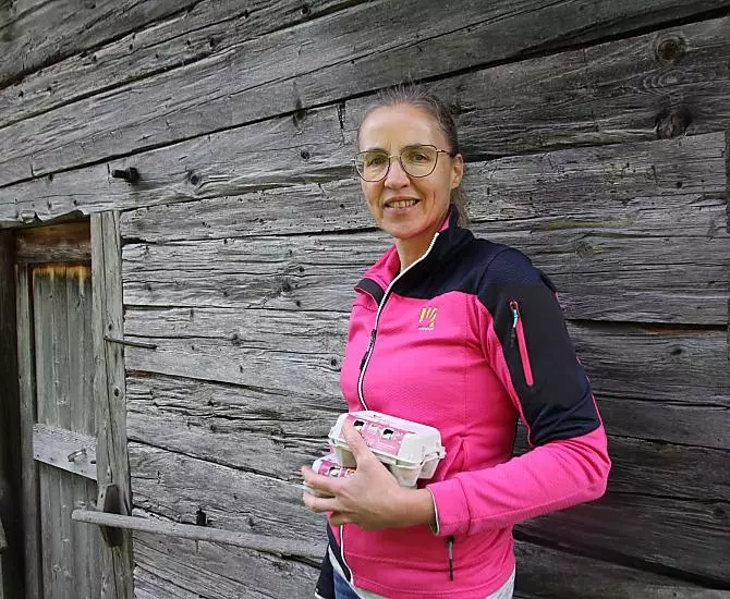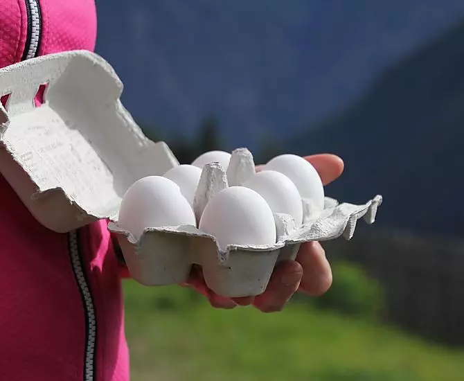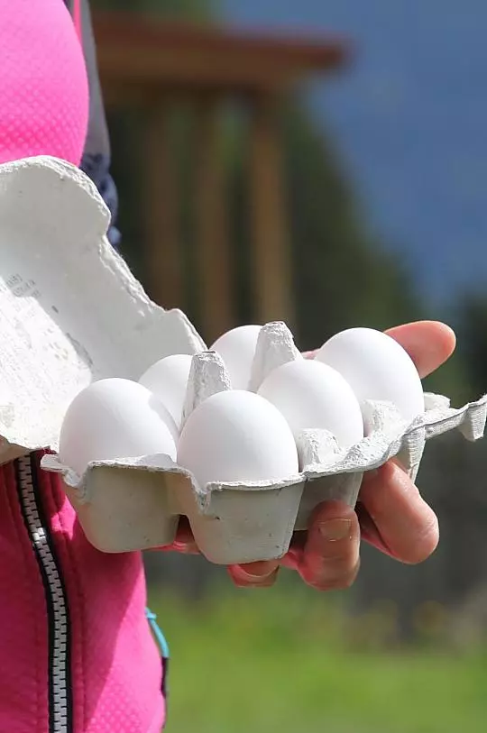 Auf dem Forerhof leben 1.500 weiße Legehennen in einem großzügig angelegten Stall mit Wintergarten für kalte Tage. Auch für den Auslauf im Freien hat Bäuerin Hilda gesorgt. Auf rund 1 ha Wiese können die Hühner picken, scharren und sich in Unterständen verstecken. Gefüttert werden sie mit gentechnikfreiem Futter.