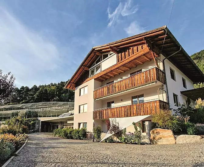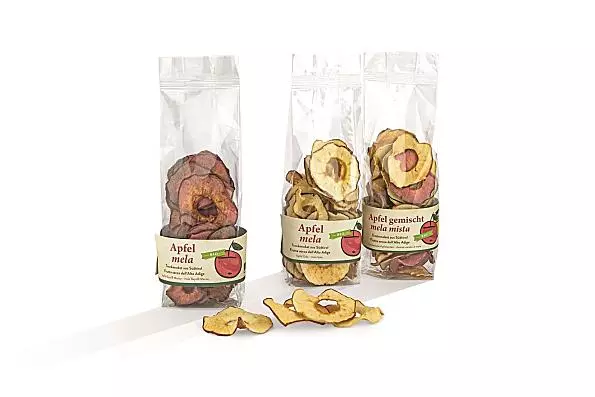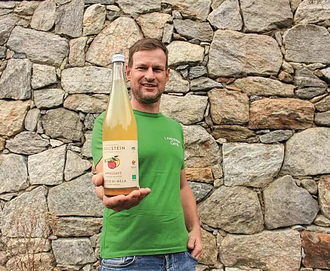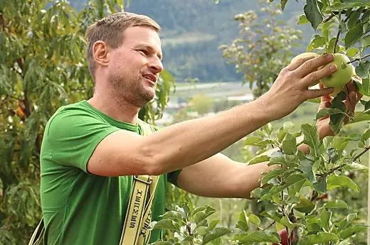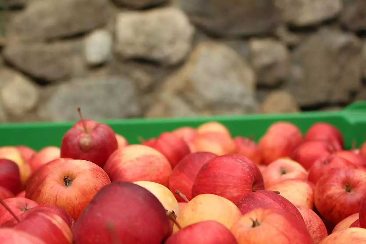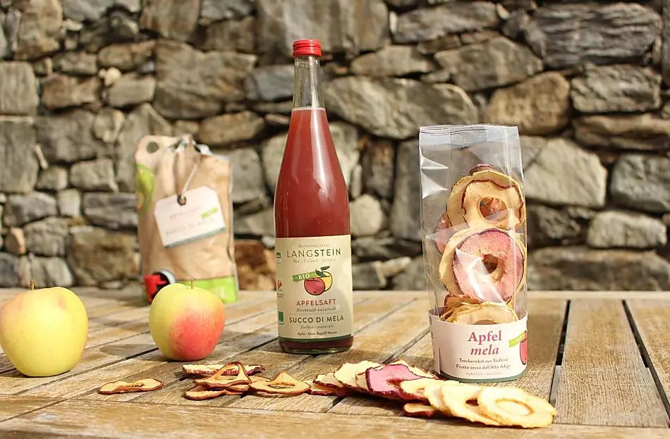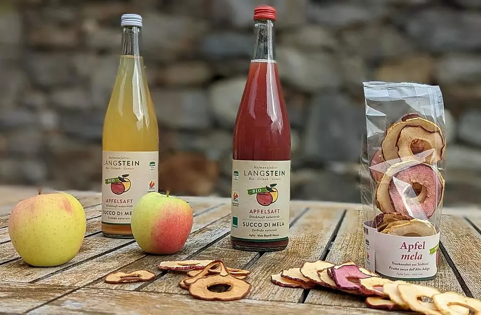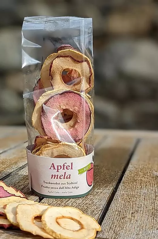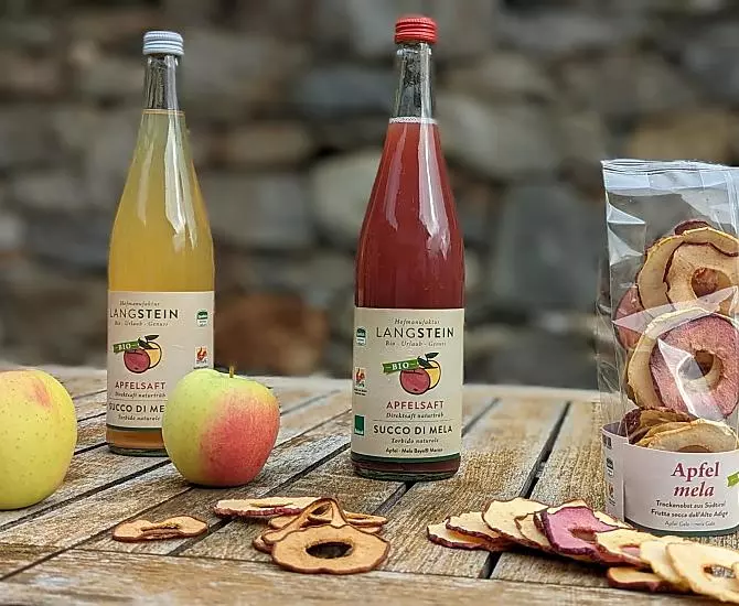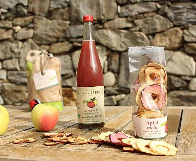 Die Apfelanlagen des Mühlgütls erstrecken sich rund um den Hof herum, auf der Sonnenseite und geprägt vom Klima des Vinschgaus. Diverse Apfelsorten sowie Palabirnen werden nach biologischen Richtlinien für die Weiterverarbeitung produziert. Geerntet wird erst dann, wenn die Früchte in einem geeigneten Reifezustand sind und sortentypische Farben aufweisen. Auf der Nordseite des Hofes pflegt Bauer Gerd außerdem ein paar sehr alte, hochstämmige Marillenbäume.