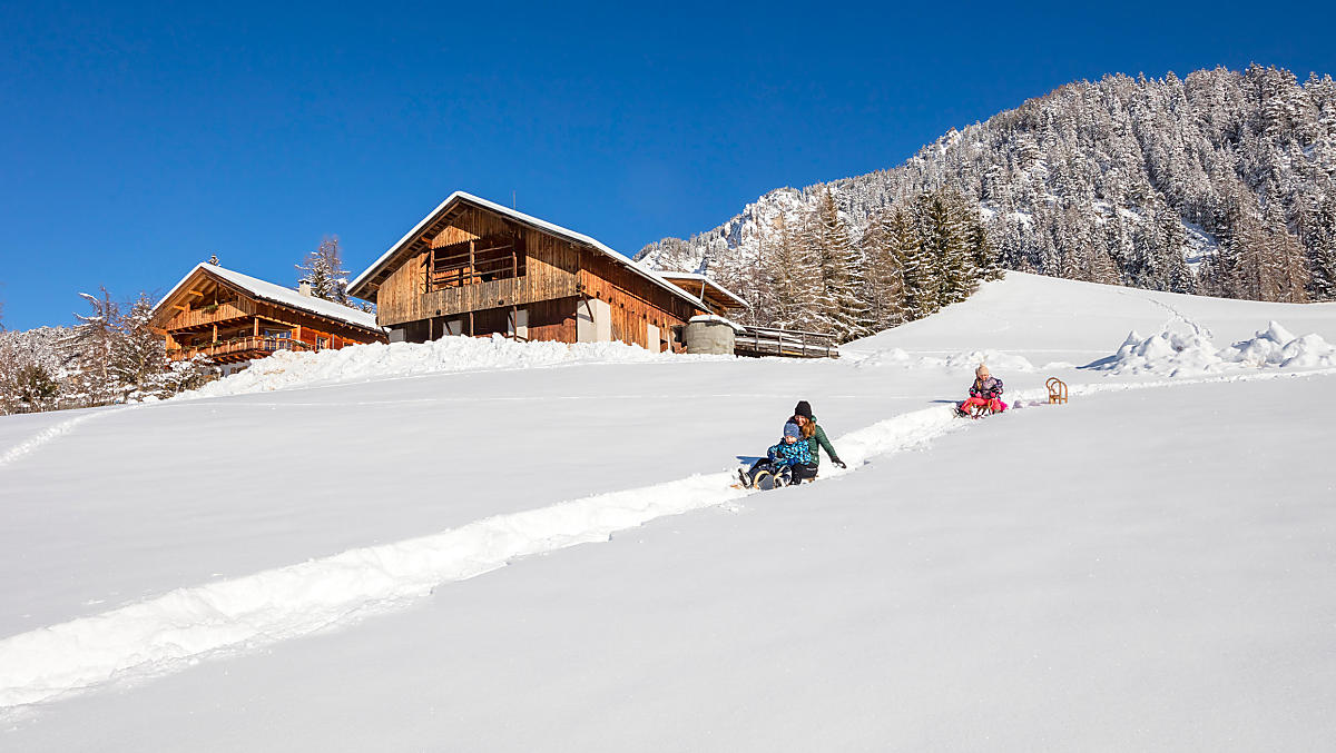Jetzt ist voller Körpereinsatz gefragt. Bei blauem Himmel und frischem Pulverschnee wird der Rodelhang am Hof zur Rennstrecke. Wer wird wohl der Sieger sein?