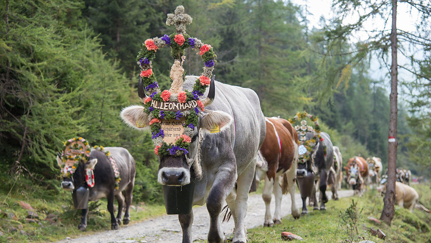 Von Juni bis September weiden Kühe, Schafe, Ziegen und Pferde auf den Südtiroler Almen in einer Höhenlage über 2.000 Meter. So auch auf der Kirchberg Alm im Ultental. Im September kommen die Tiere von ihrer Sommerfrische wieder ins Tal zurück. Dabei sind vor allem die Kühe sehr aufwendig geschmückt: Die Leitkuh und die ihr folgenden Kühe tragen Kränze aus Tannengrün, verziert mit kunstvollen Stickereien. Für die Schaulustigen gibt es selbstgemachte Krapfen der Bäuerinnen und auch Getränke. Ein wahres Fest, das zugleich die kalte Jahreszeit einläutet. In St. Gertraud gibt es am Bauernmarkt eine Menge zu entdecken.