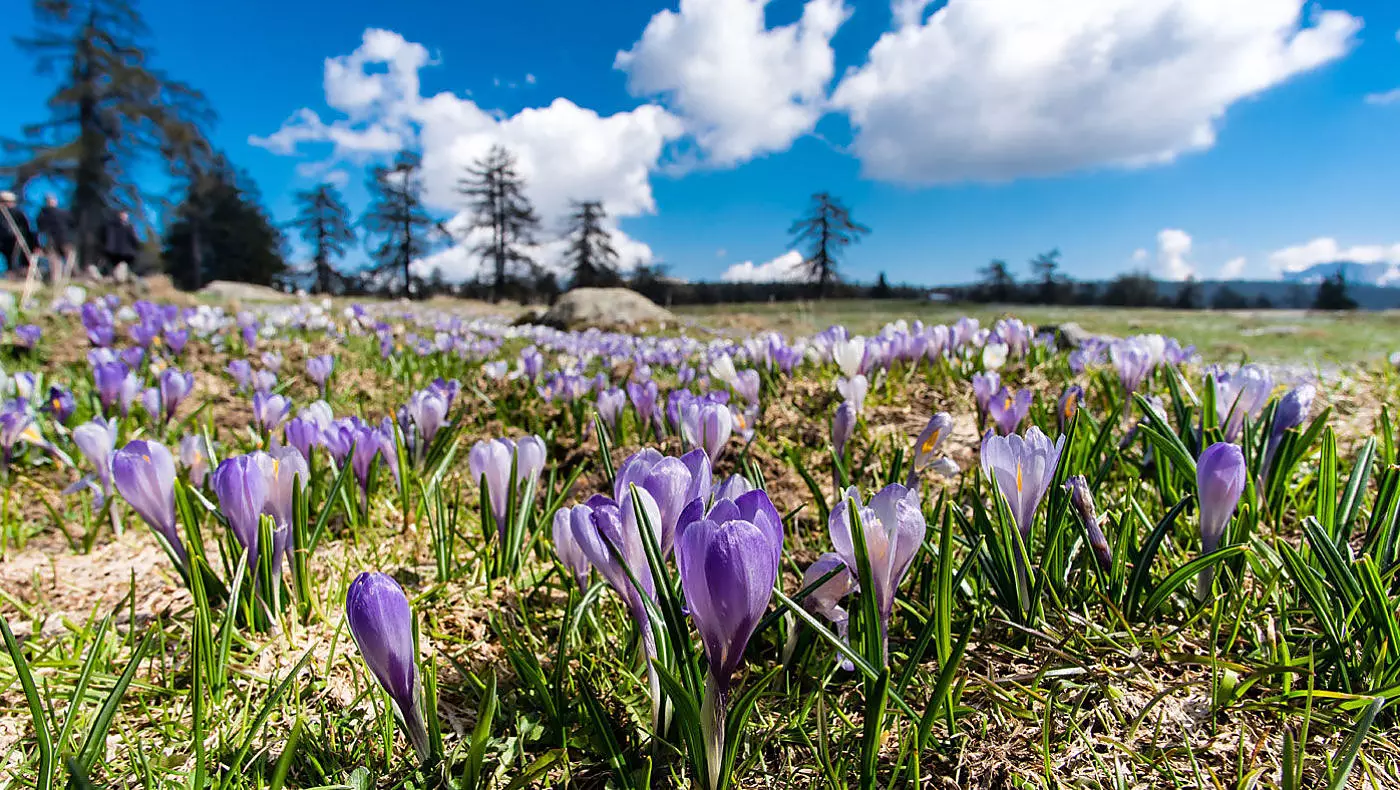 Die Krokusse sprießen im Frühling auf den Gebirgswiesen in Mölten aus dem Boden, fast als würden sie auf das Ende des Winters anstoßen.
