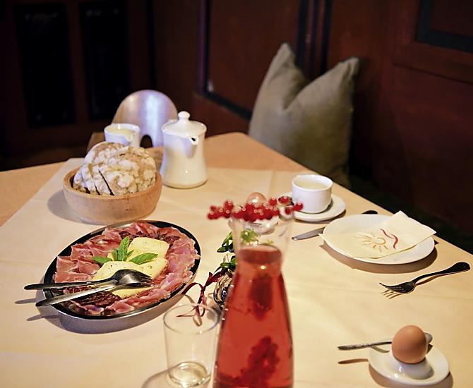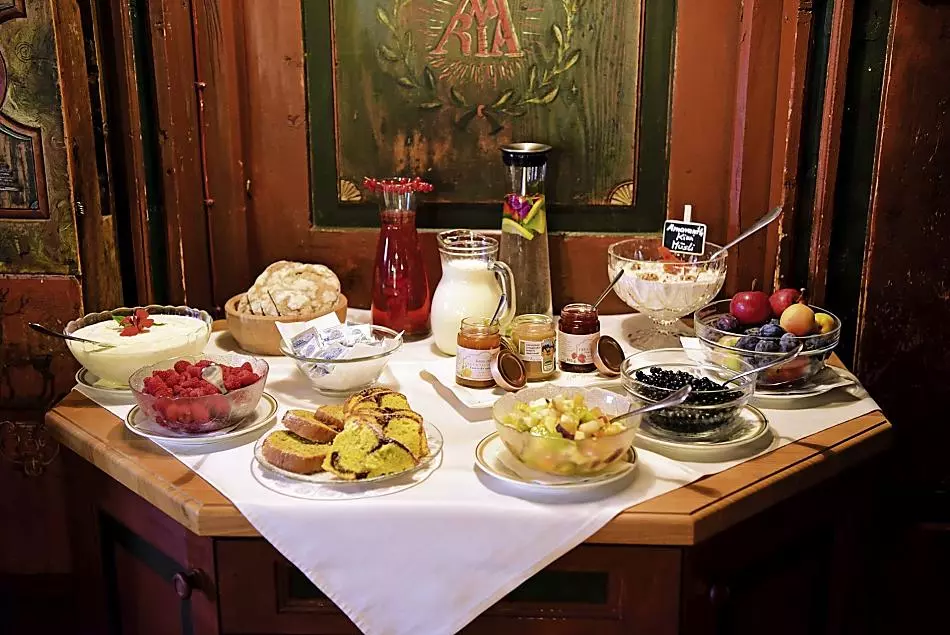 - Hofeigene Produkte beim Frühstück: Milch, Joghurt, Käse, Butter, Andere Milchprodukte, Speck, Geselchtes Rindfleisch, Würste, Eier, Honig, Fruchtaufstriche, Sirup, Kräutertee, Getreide, Backwaren, Frisches Obst je nach Saison