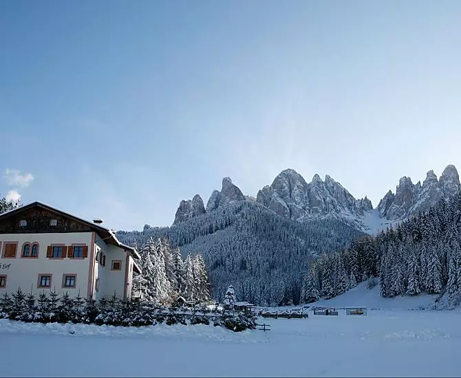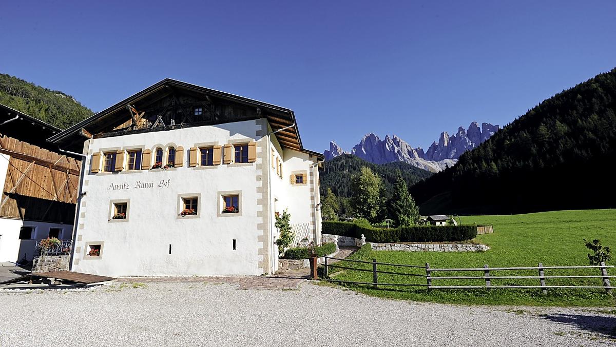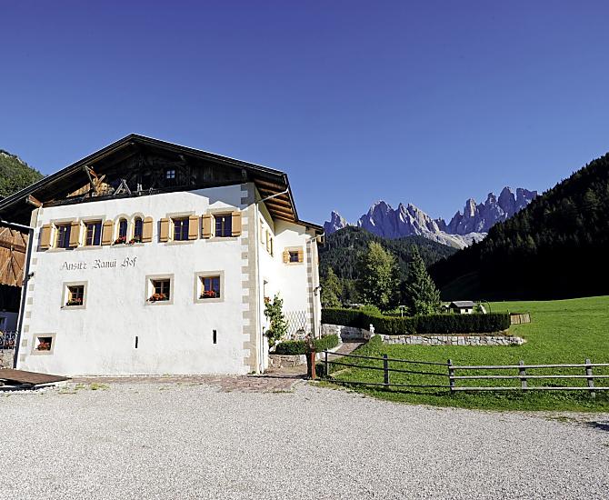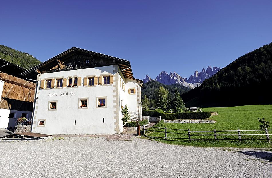 Der Ansitz Ranuihof ist ein alter ehemaliger Jagdansitz am Ende des Tales, fast am Fuße der Geislerspitzen. Vom Hof aus stehen Ihnen alle Möglichkeiten des Wanderns oder des Bergsteigens offen! In unserer heimeligen historischen Stube genießen Sie ein vitales, plastikfreies Fühstück mit hofeigenen Produkten. Die Terrasse und die nett angelegte Liegewiese laden gerne zum Verweilen ein. Unser Kneippweg ist Ihr Kraftort im Bergurlaub! Eigener Parkplatz.