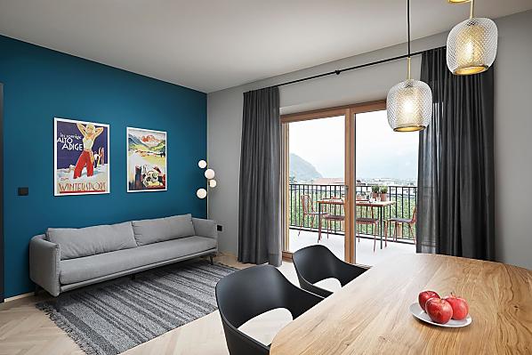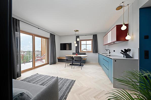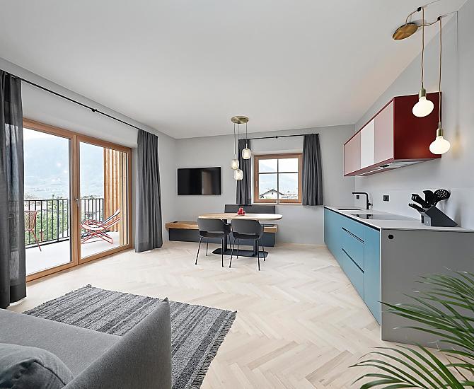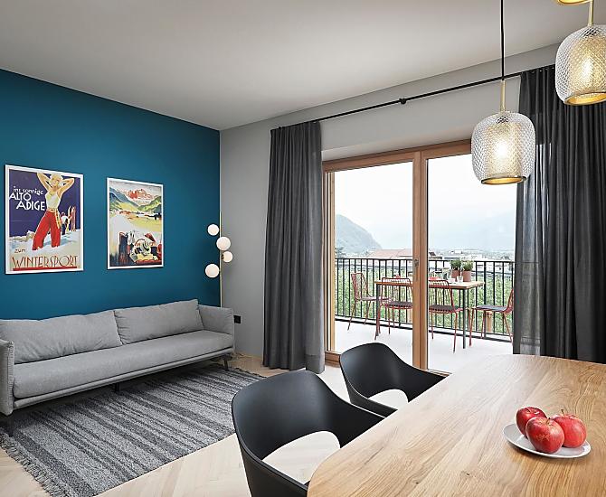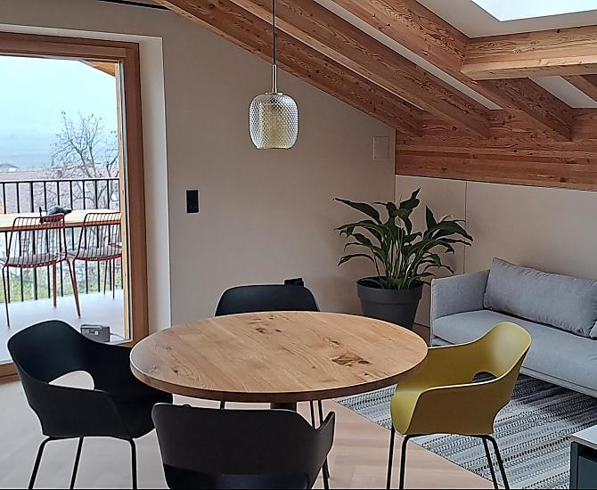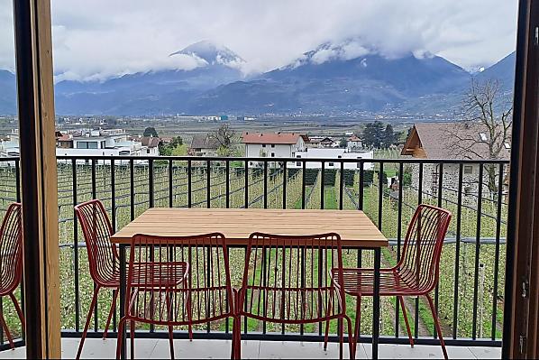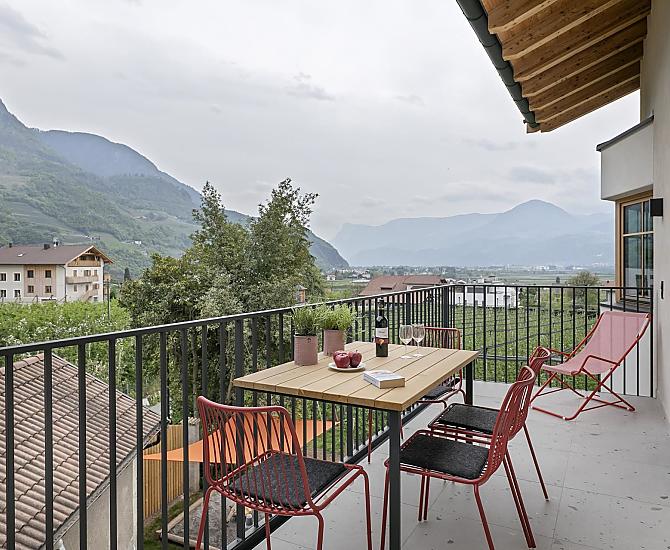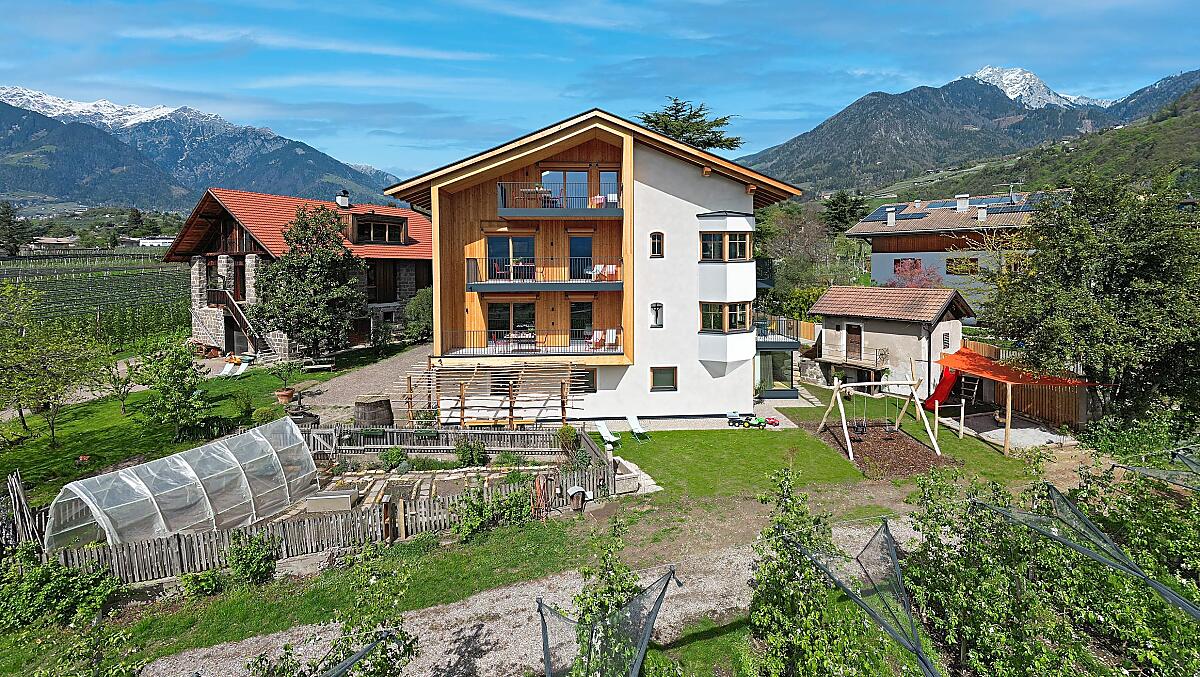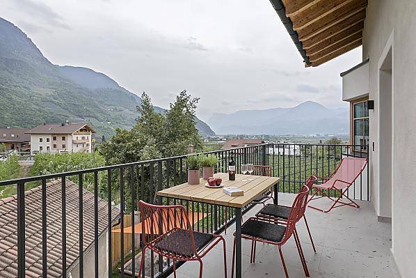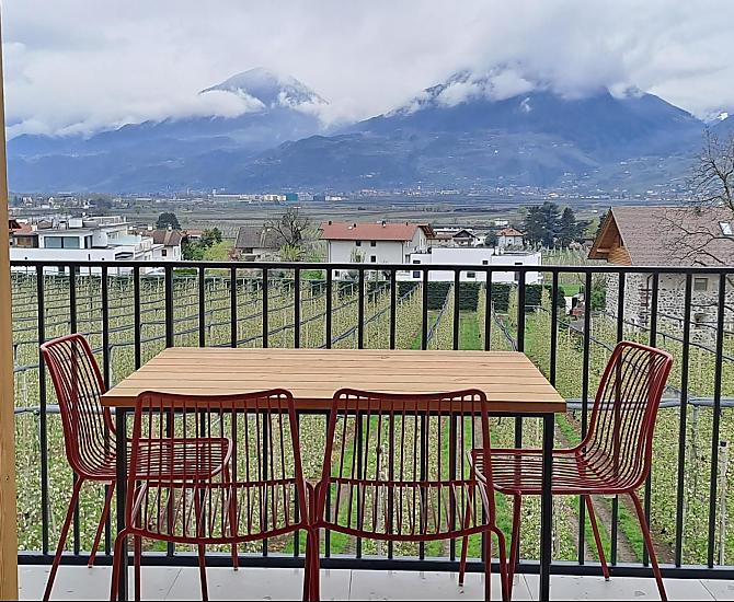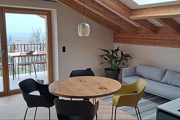 Haus mit vier neuen Apartments, Aufenthaltsraum mit Gemeinschaftsküche, Terrasse und Garten. Ruhige Lage im Grünen, nähe Stadtzentrum. Freier Blick ins Etschtal.