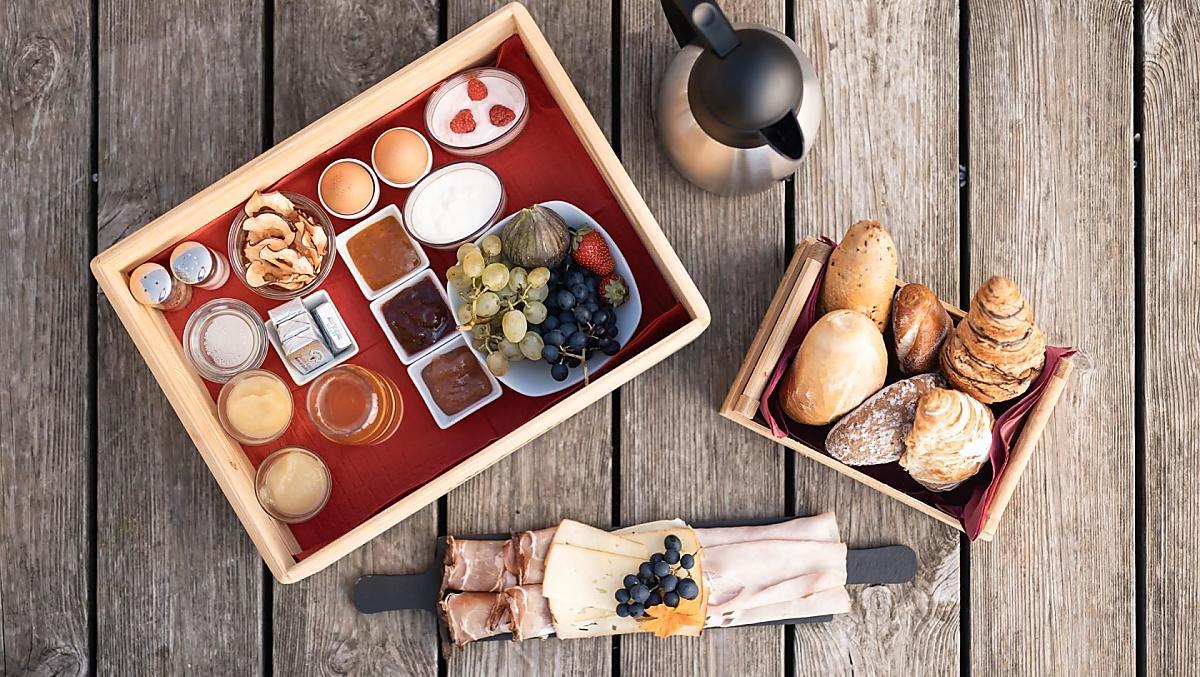- Hofeigene Produkte beim Frühstück: Fruchtaufstriche, Sirup, Fruchtsäfte, Trockenobst, Kräutertee, Frisches Gemüse je nach Saison, Frisches Obst je nach Saison