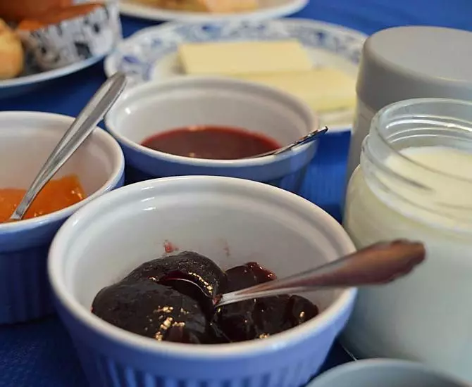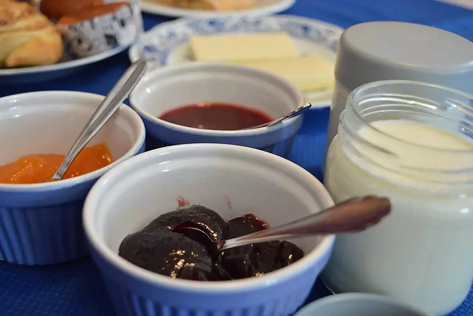- Hofeigene Produkte beim Frühstück: Milch, Joghurt, Speck, Eier, Honig, Fruchtaufstriche, Gelees, Kräutertee, Brot, Backwaren