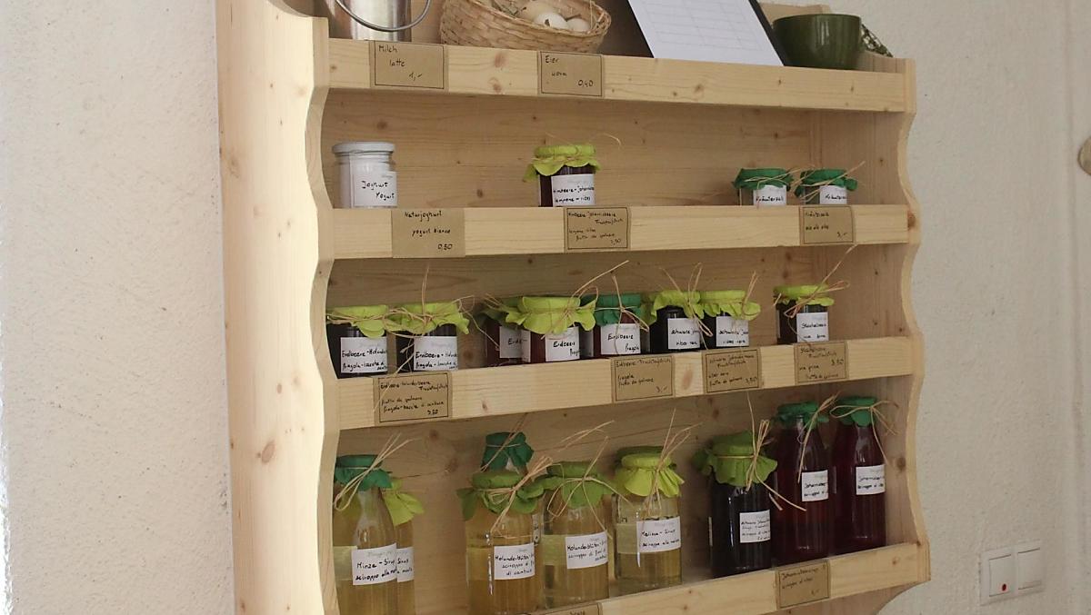 - Hofeigene Produkte beim Frühstück: Milch, Joghurt, Eier, Fruchtaufstriche, Sirup, Kräutertee, Kräutergewürze, Brot, Backwaren