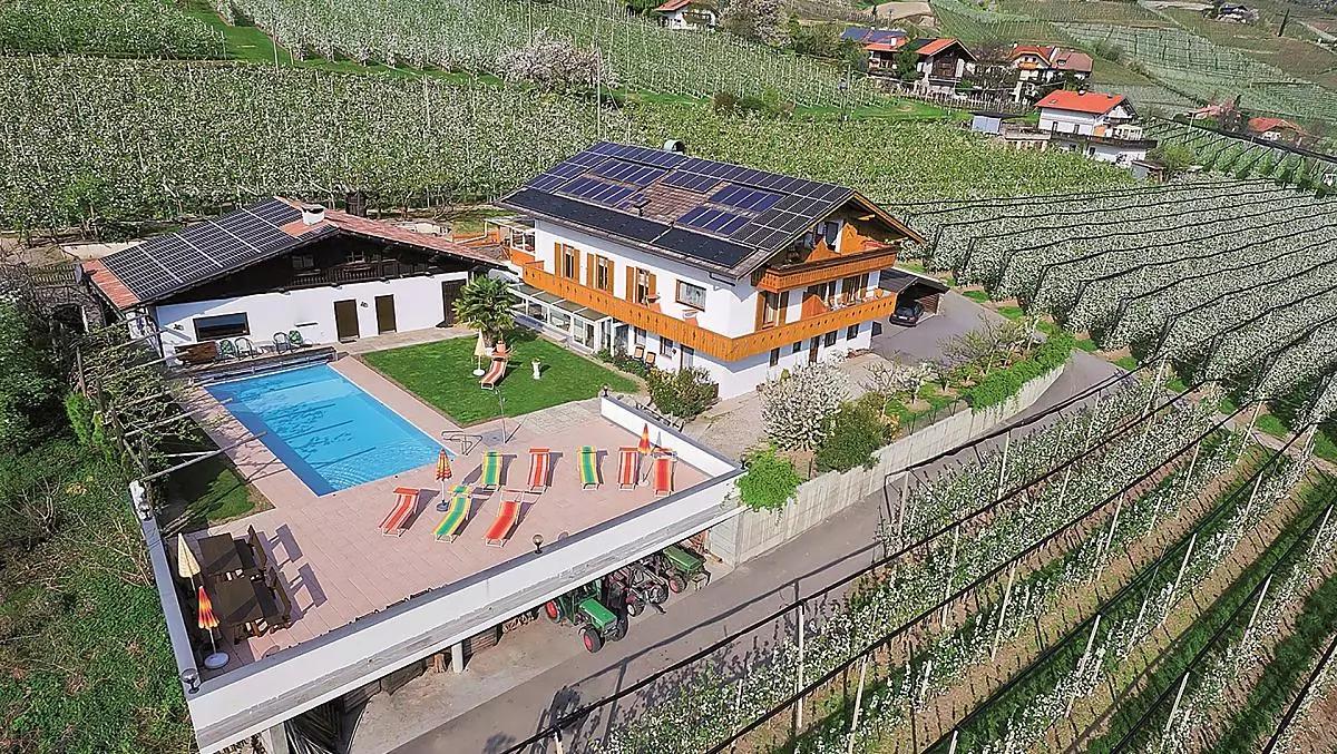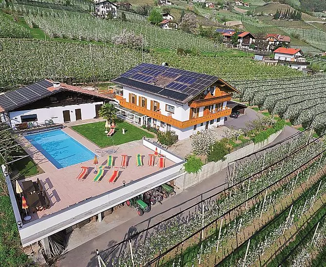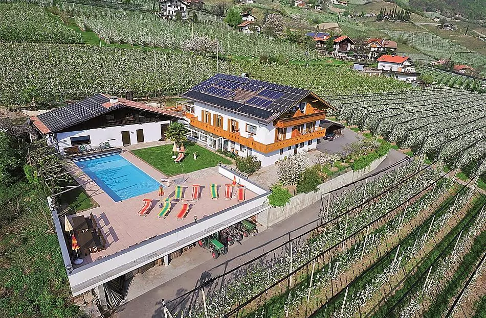 Unser Burggräflerhof – inmitten von eigenen Obstgärten – befindet sich in ausgesprochen ruhiger Lage, mit herrlichem Panoramablick auf die Kurstadt Meran und die Umgebung.