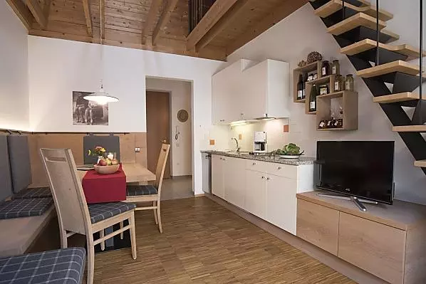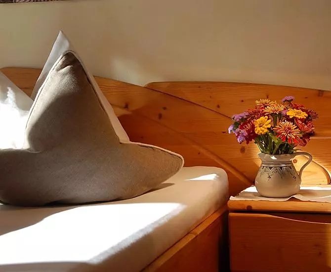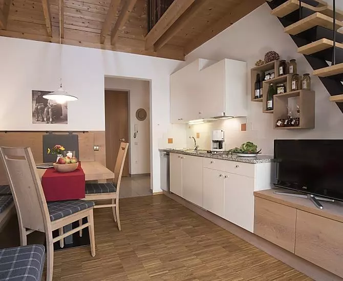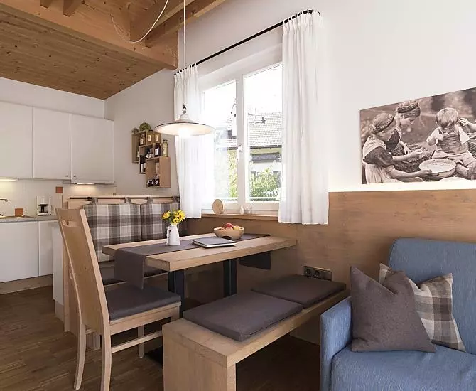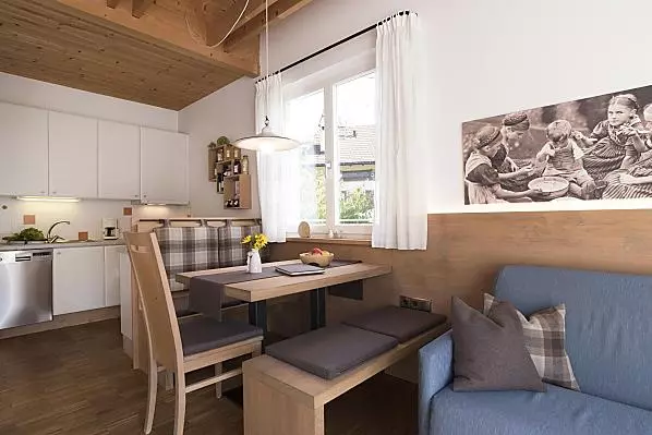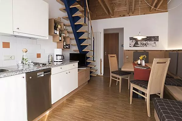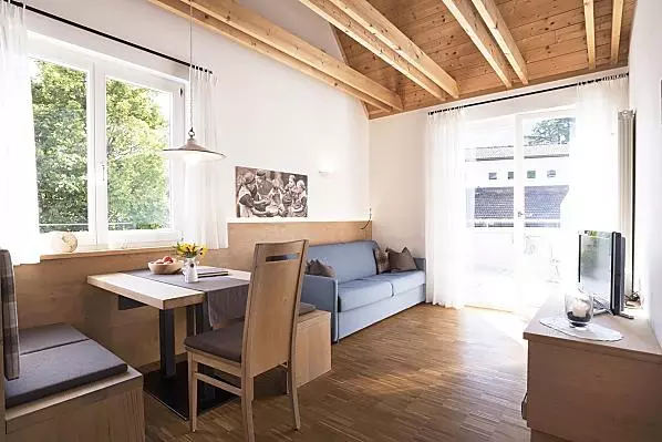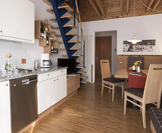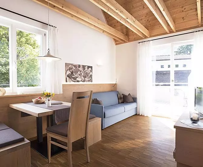 Die Ferienwohnungen wurden mit viel Liebe zum Detail eingerichtet. Die Ausstattung ist klassisch-modern, die Massivholzmöbel sorgen für eine behagliche Atmosphäre und das offene Dachgebälk verleiht der Wohnung zusätzlichen Charme.