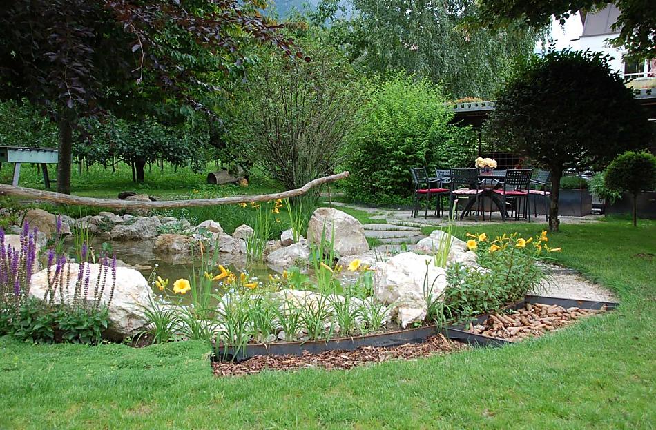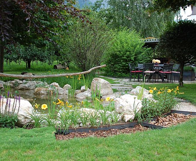 Lassen Sie sich vom Frühjahr bis in den Herbst auf der Terrasse von den warmen Sonnenstrahlen streicheln und relaxen Sie mit einem guten Buch. Auch der große Garten mit verschiedenen gemütlichen Ecken bietet Raum zur Entspannung – erfrischen Sie Ihre müden Füße nach einer Wanderung im Kneippteich und erleben Sie Naturmaterialien an Ihren Füßen.