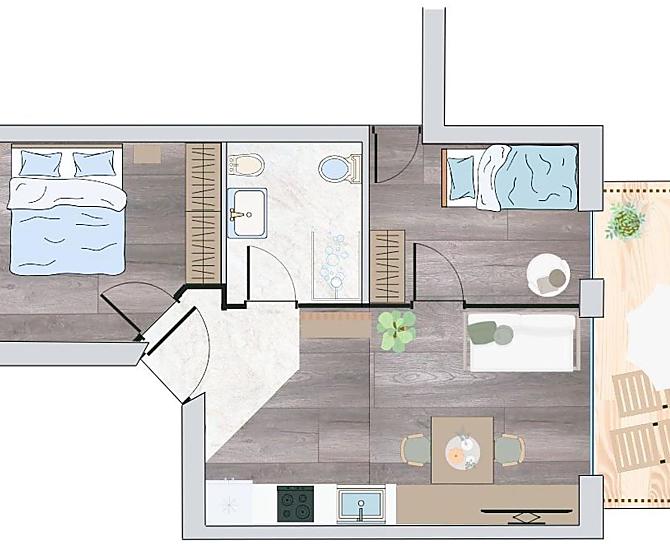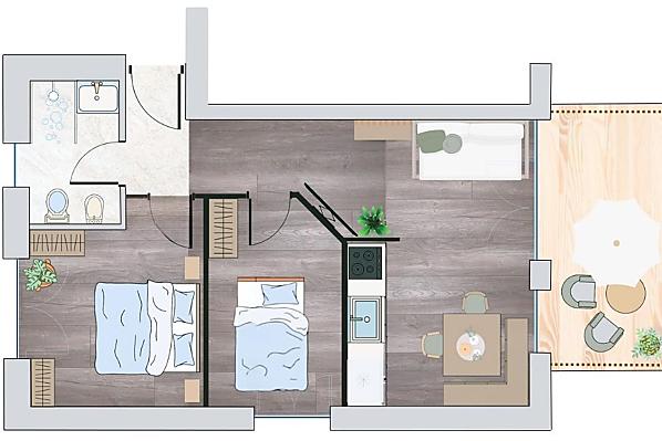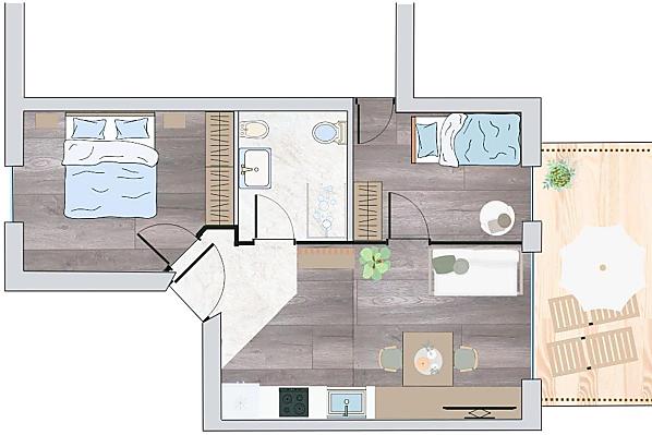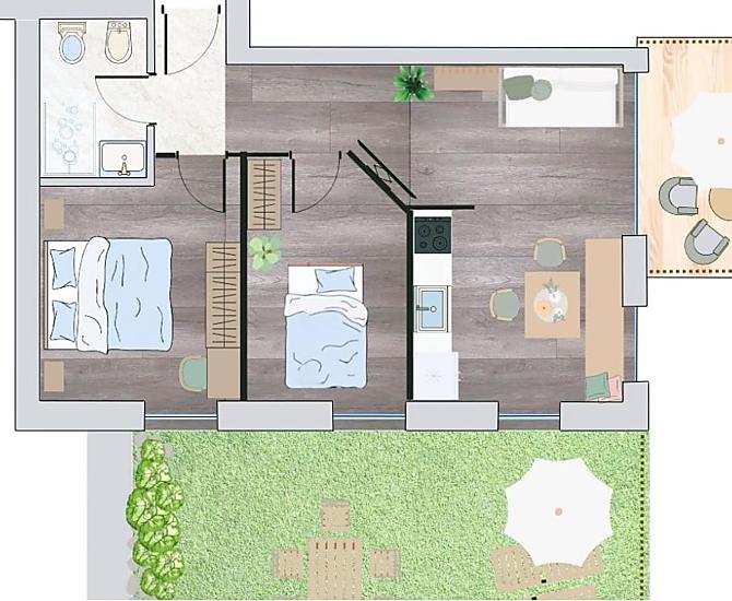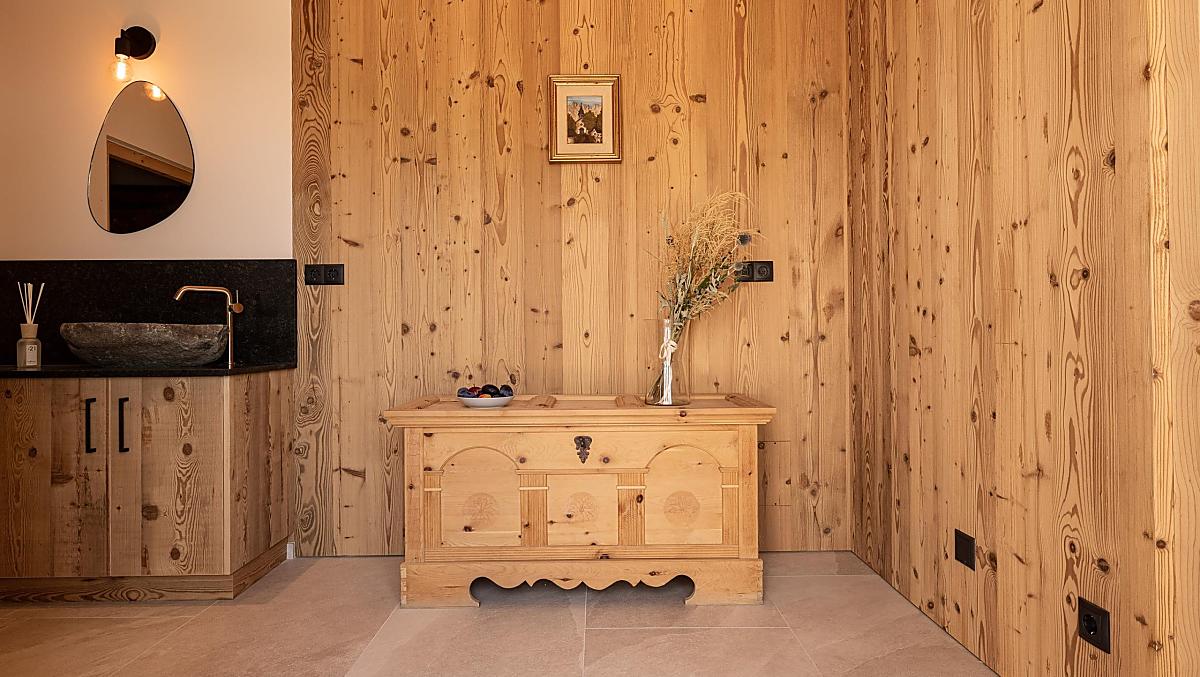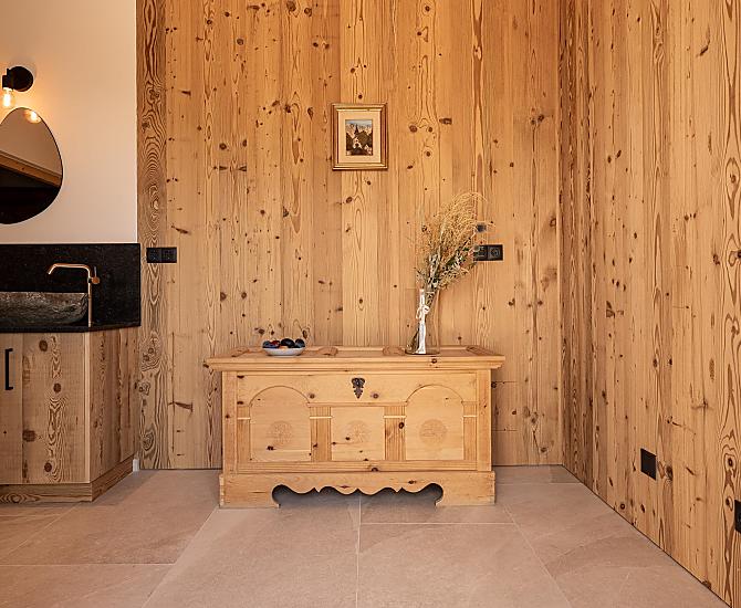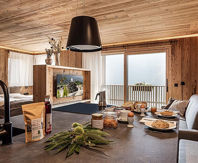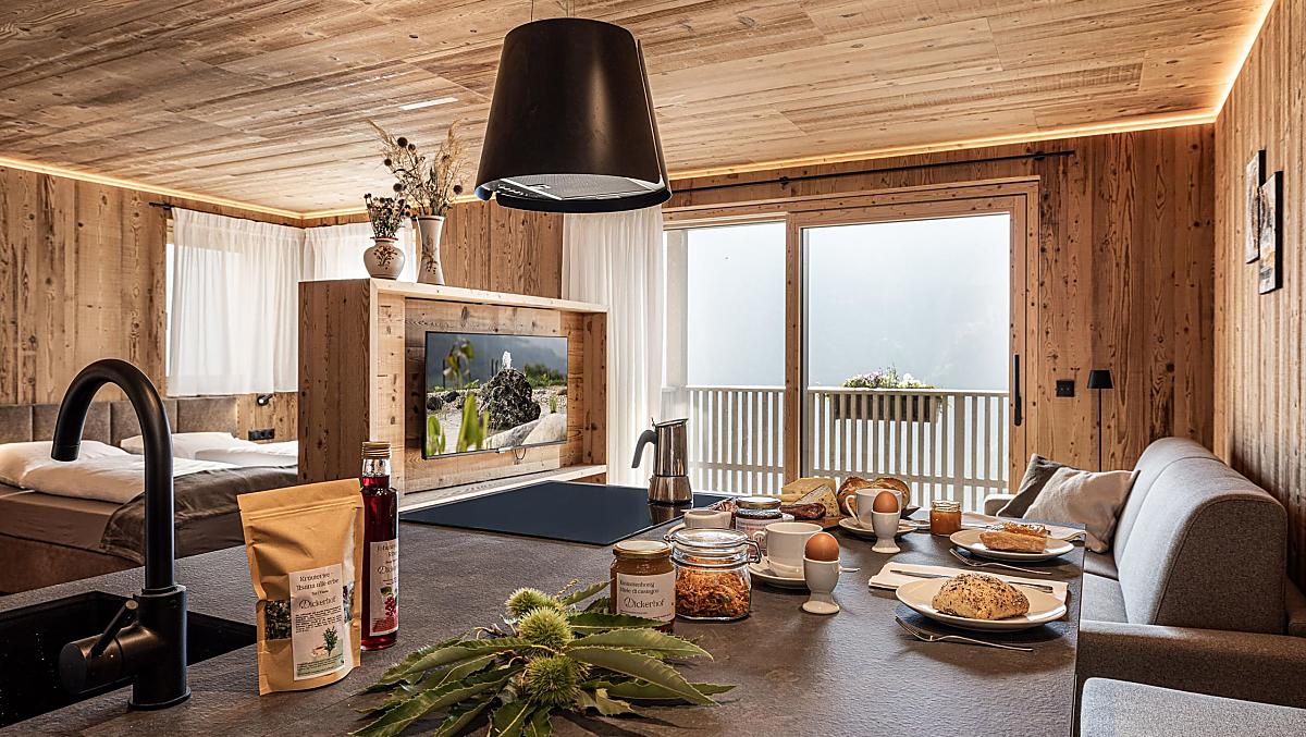 Die stilvoll eingerichteten Apartments mit privater Terrasse vereinen modernen Komfort mit alpinem Charme. Der liebevoll gestaltete Außenbereich und der exklusive Wellnessbereich mit Sauna und Ruheraum laden dazu ein, Körper und Geist zu verwöhnen.