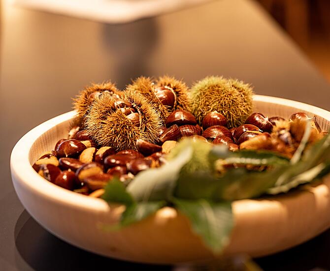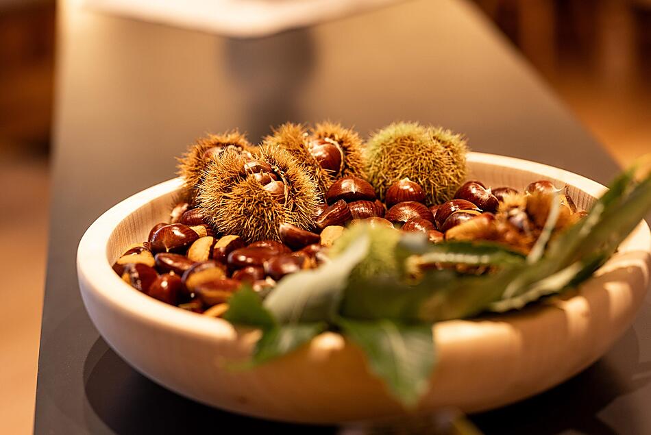 - Frisches Obst je nach Saison (Beeren, Heidelbeeren, Johannisbeeren, Kastanien, Kirschen, Marillen, Zwetschgen)
