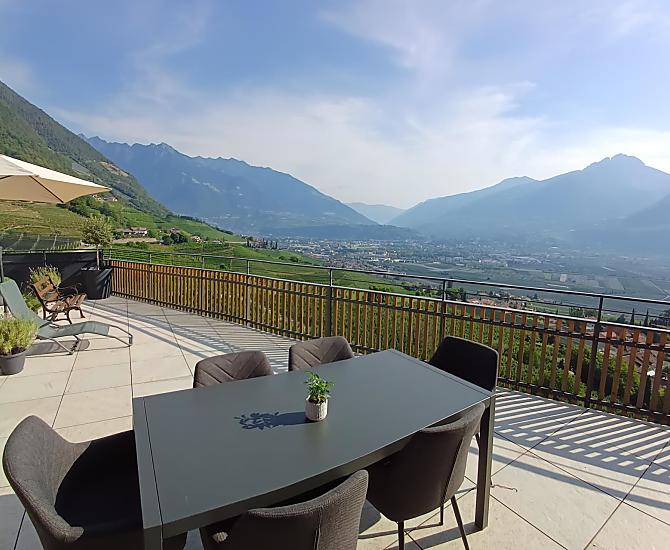 Ruhig und wunderschön unterhalb des Marlinger Waalwegs gelegen, mit herrlichem Blick über die Kurstadt Meran und das gesamte Etschtal.