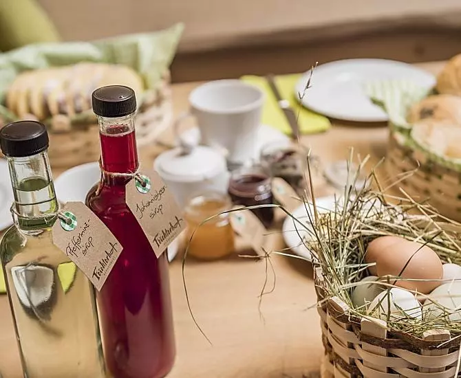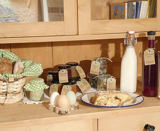 - Hofeigene Produkte beim Frühstück: Milch, Joghurt, Speck, Würste, Eier, Fruchtaufstriche, Sirup, Gelees, Kräutertee, Backwaren, Frisches Gemüse je nach Saison