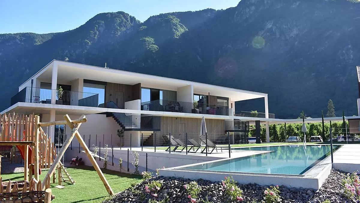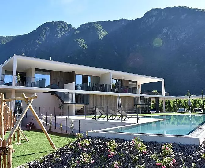 Genießen Sie Ihren Urlaub auf unserem Obstbauernhof in ruhiger und doch zentraler Lage. Moderne Architektur und stilvolle Einrichtung mit geraden Linien, natürlichen Materialien und Farben! Lichtdurchflutete und klimatisierte Ferienwohnungen mit herrlichem Blick durch die Panoramafenster auf das Etschtal und in die umliegende Bergwelt. Ganz privat auf der geräumigen Terrasse oder mitten im großen Garten die Seele baumeln lassen. Eintauchen in das 20 m lange Salzwasserbecken und die vielen Vorteile für Radfahrer nutzen. Mit dem Naturspielplatz ideal für Familien, aber auch perfekter Ausgangspunkt für Sport, Kultur und Genuss.
