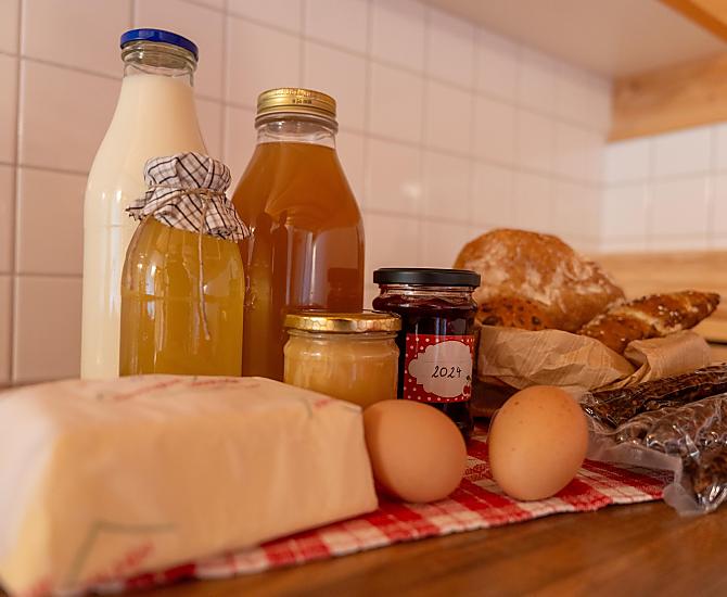 - Hofeigene Produkte beim Frühstück: Käse, Butter, Würste, Eier, Honig, Fruchtaufstriche, Sirup, Fruchtsäfte, Kräutergewürze, Frisches Gemüse je nach Saison, Frisches Obst je nach Saison