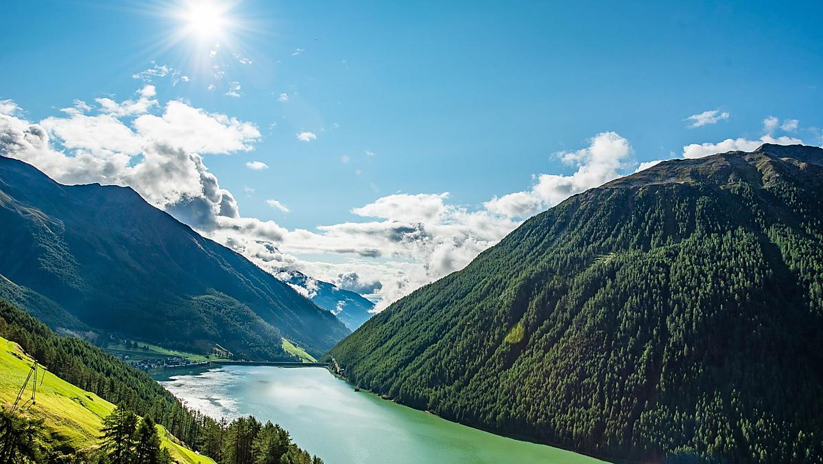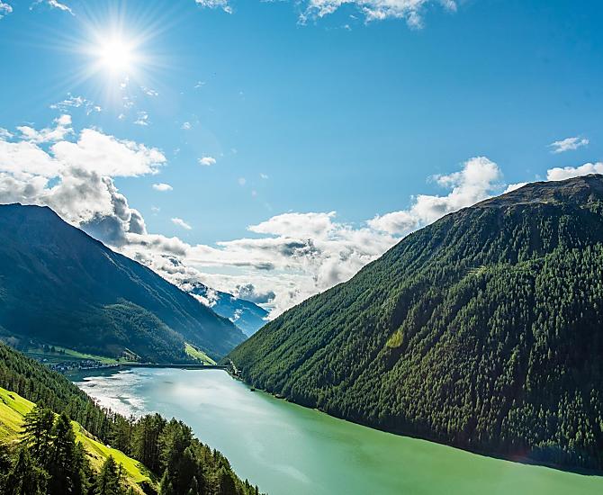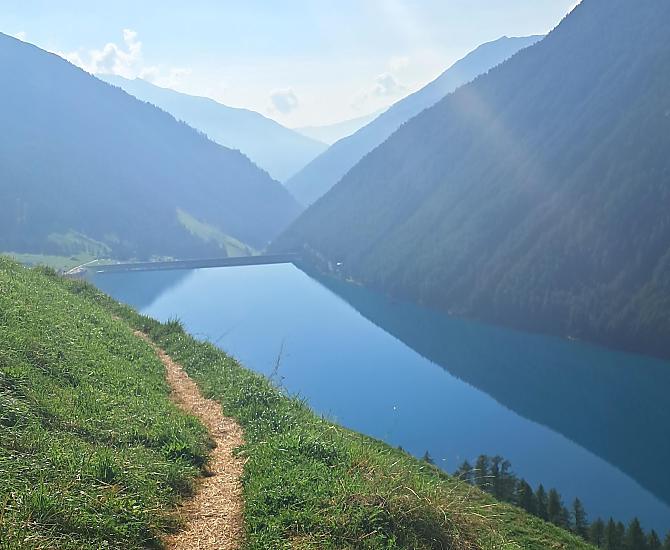 Der Bio-Bergbauernhof liegt auf 1.973 m auf der Sonnenseite des Schnalstales, hoch über dem Vernagter Stausee. Vom Hof hat man einen wunderschönen Panoramablick auf den Stausee, die umliegenden Berge und ganz hinten am Horizont sieht man den Latemar.