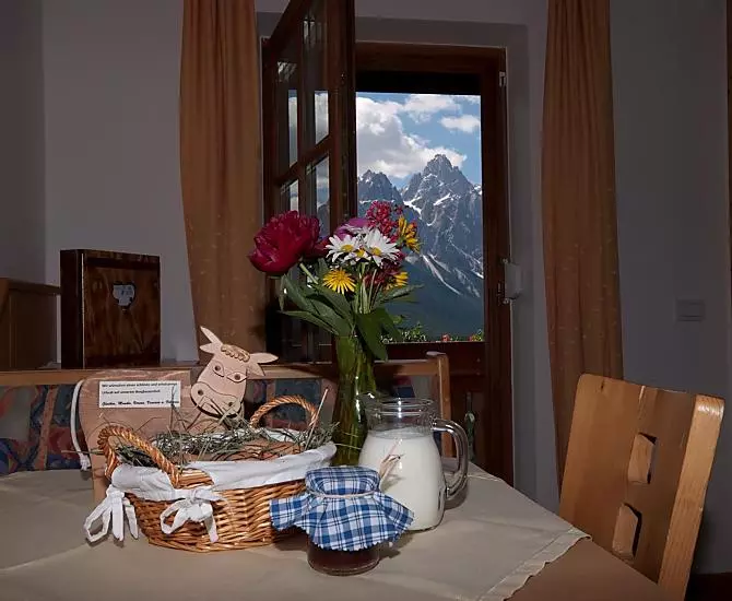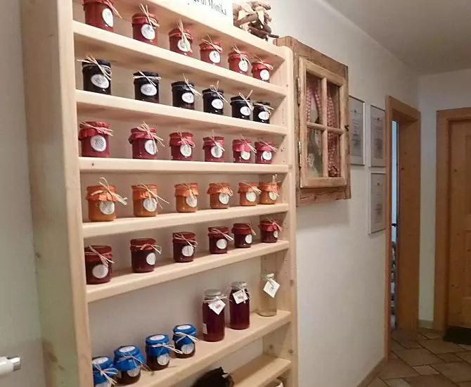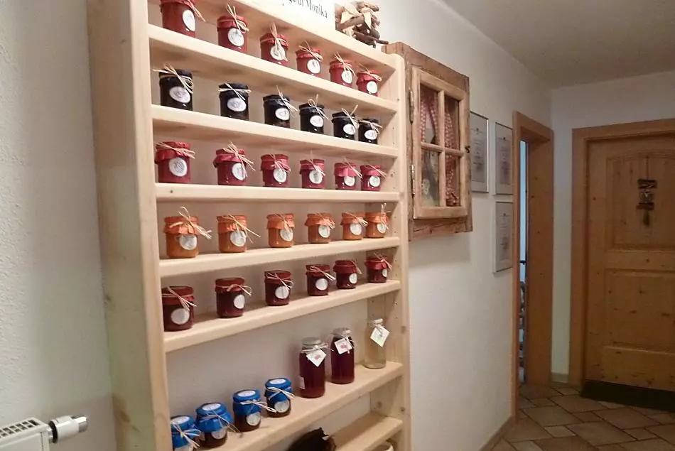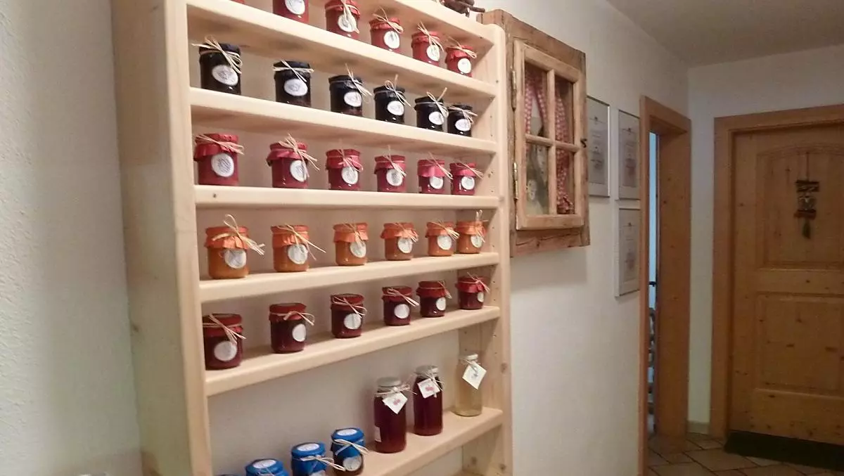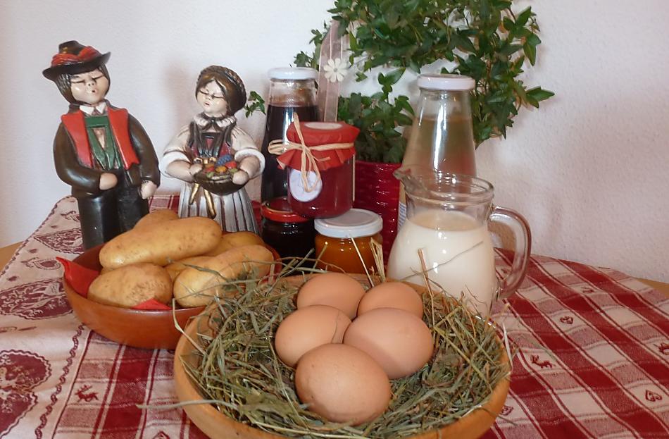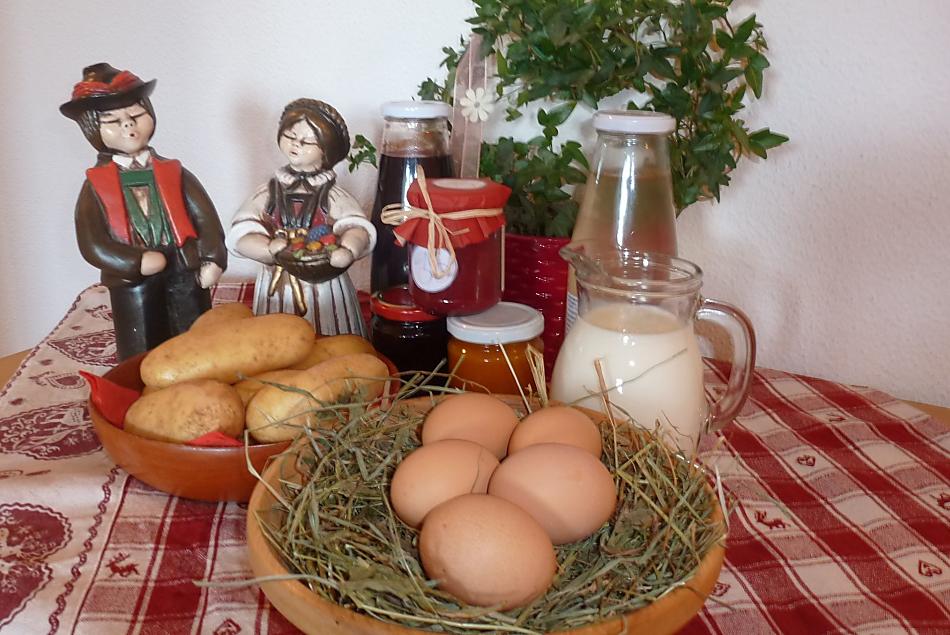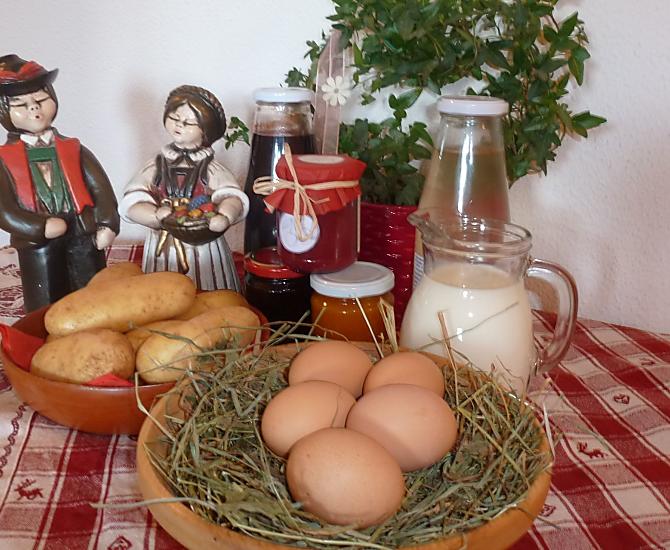 - Hofeigene Produkte beim Frühstück: Milch, Joghurt, Eier, Fruchtaufstriche, Sirup, Backwaren, Frisches Gemüse je nach Saison, Frisches Obst je nach Saison