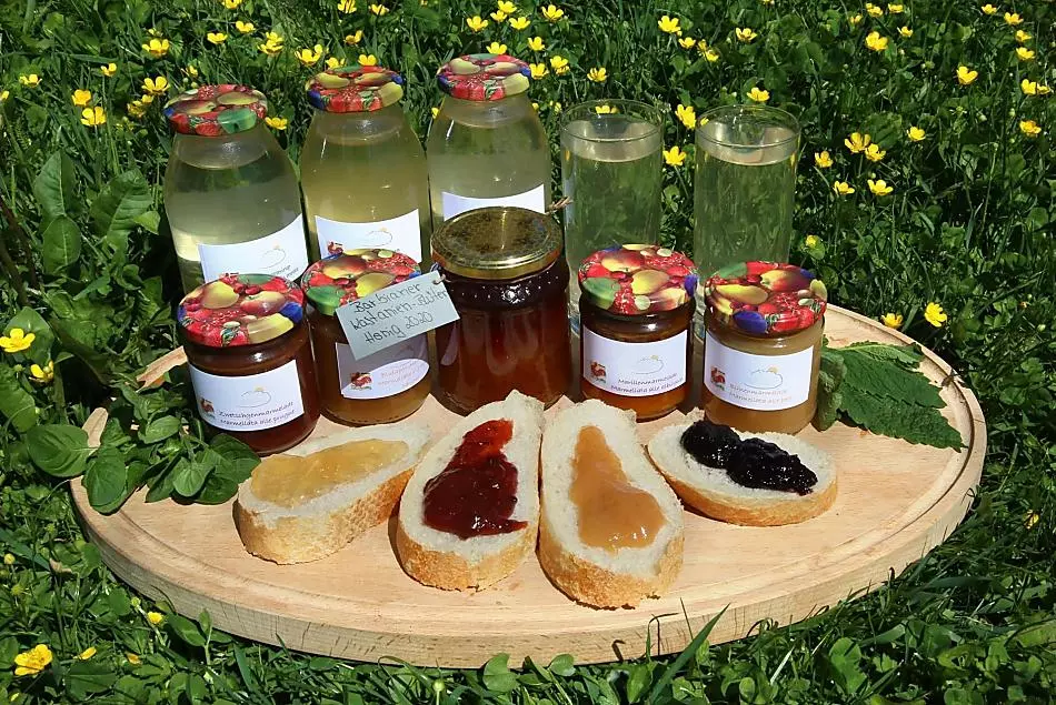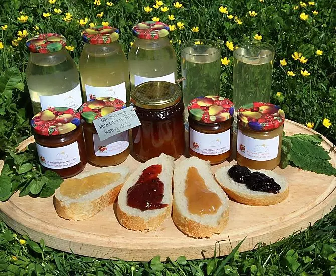 - Die hausgemachten Marmeladen und Säfte, Bauernbrot und Honig