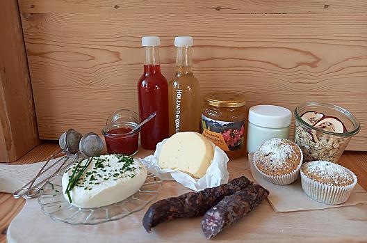 - Hofeigene Produkte beim Frühstück: Eier, Honig, Fruchtaufstriche, Sirup, Fruchtsäfte, Trockenobst, Backwaren, Frisches Obst je nach Saison