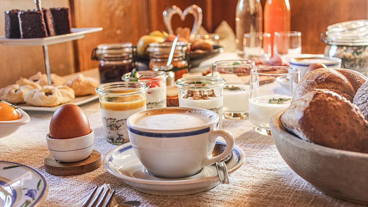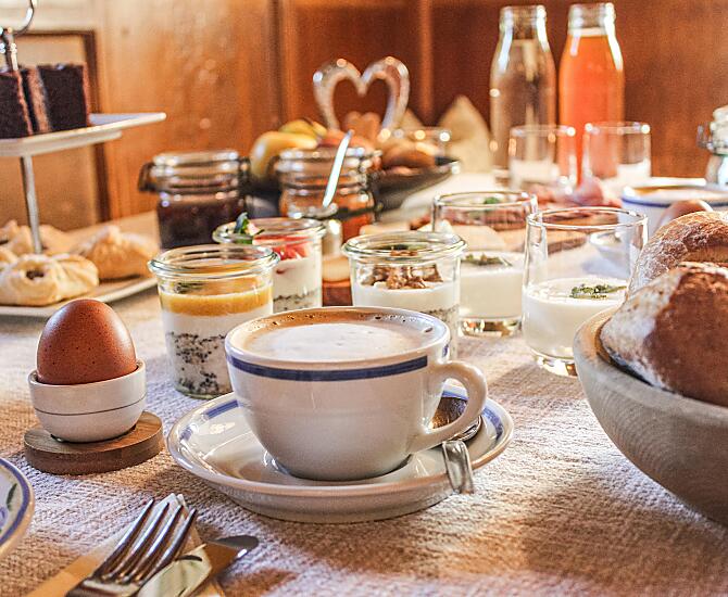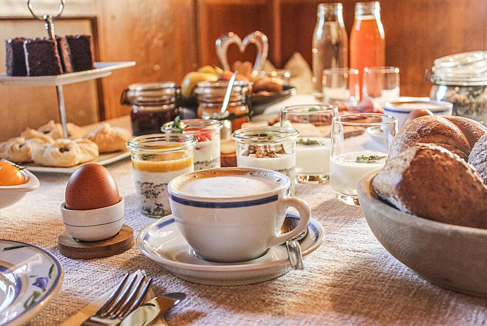 - Das Frühstück mit vielen hofeigenen und selbstgemachten Produkten.