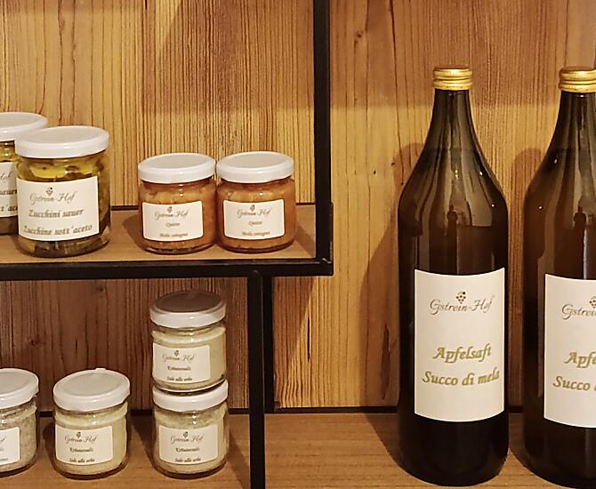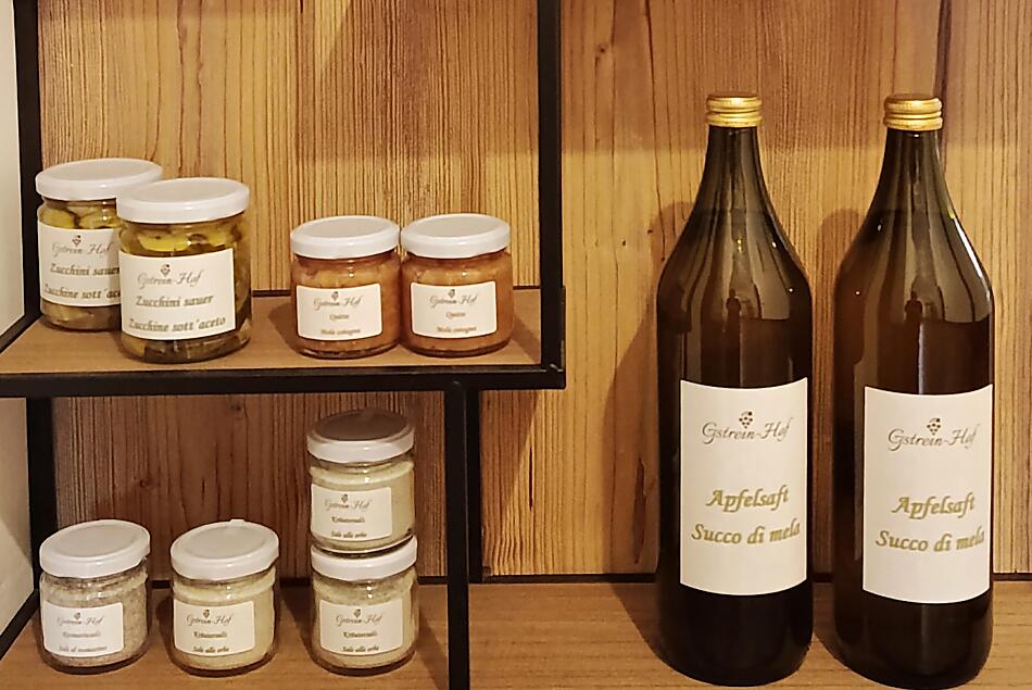 - Hofeigene Produkte beim Frühstück: Eier, Fruchtaufstriche, Sirup, Fruchtsäfte, Trockenobst, Gelees, Chutneys, Eingelegtes, Kräutergewürze, Brot, Backwaren, Frisches Gemüse je nach Saison, Frisches Obst je nach Saison