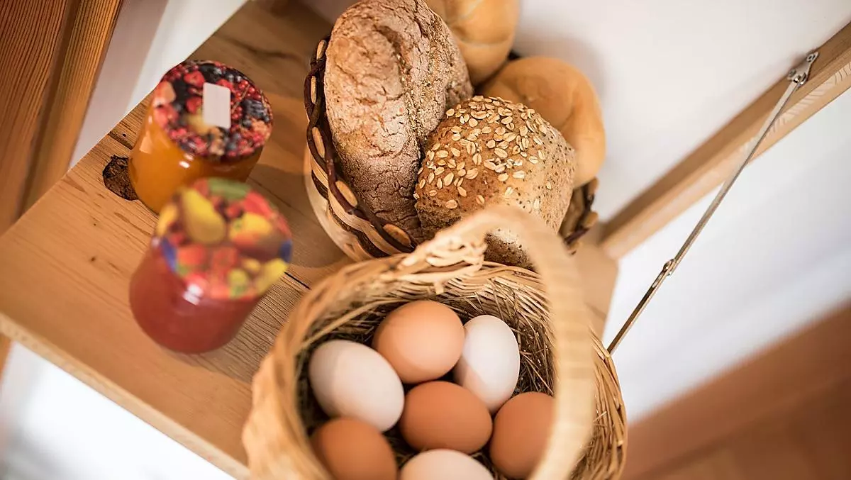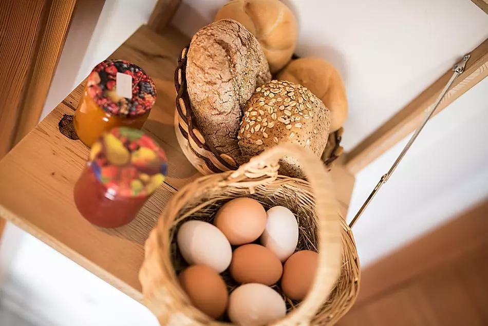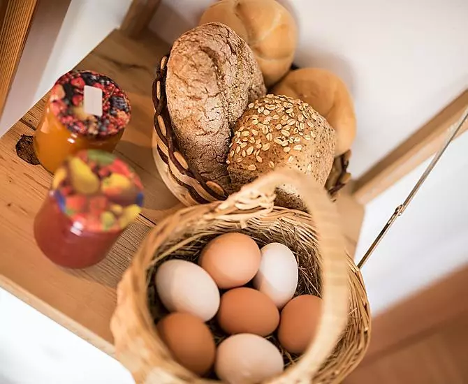 Eier, Fruchtaufstriche, Fruchtsäfte, Kräutergewürze, Frisches Obst je nach Saison ...