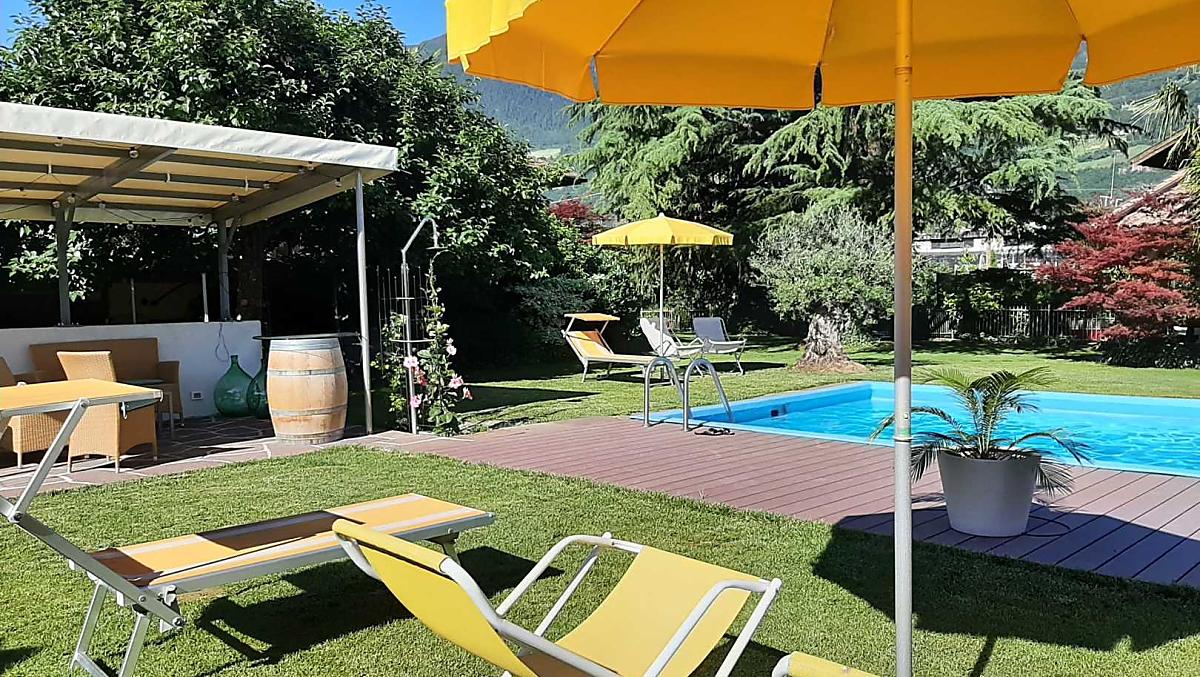 Unser Haus befindet sich inmitten von Apfelwiesen mit herrlichem Blick aufs Unterland, in flacher, sonniger Lage südlich der Handelsstadt Bozen. Entspannen Sie in unserem liebevoll gepflegten Garten mit beheiztem Pool, während die Kinder auf dem Spielplatz toben und unsere Haustiere kennenlernen. Trampolin, Tischtennis und -fußball, Aufenthaltsraum mit Kamin und Grillstelle sind vorhanden. Lassen Sie sich bei unseren Grillabenden verwöhnen! Morgendlicher Brötchendienst auf Anfrage.