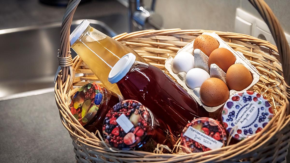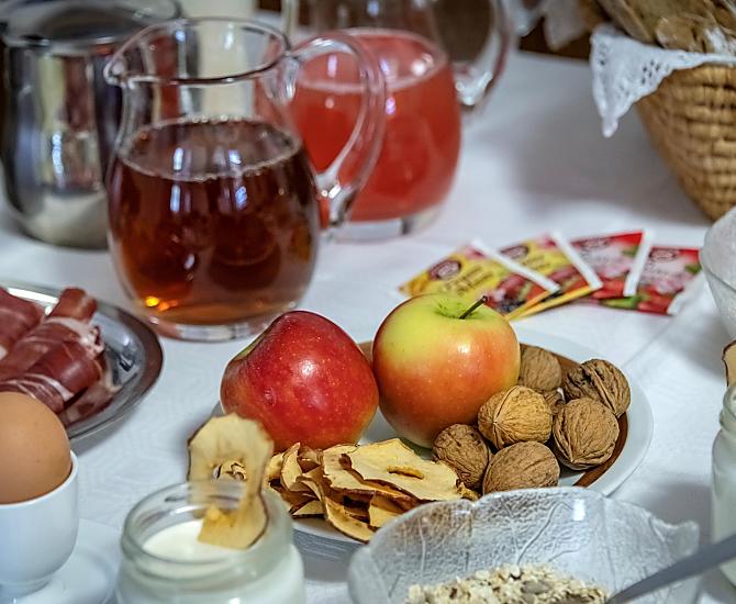 - Hofeigene Produkte beim Frühstück: Milch, Joghurt, Speck, Eier, Fruchtaufstriche, Sirup, Fruchtsäfte, Trockenobst, Kräutertee, Kräutergewürze, Backwaren, Frisches Gemüse je nach Saison, Frisches Obst je nach Saison