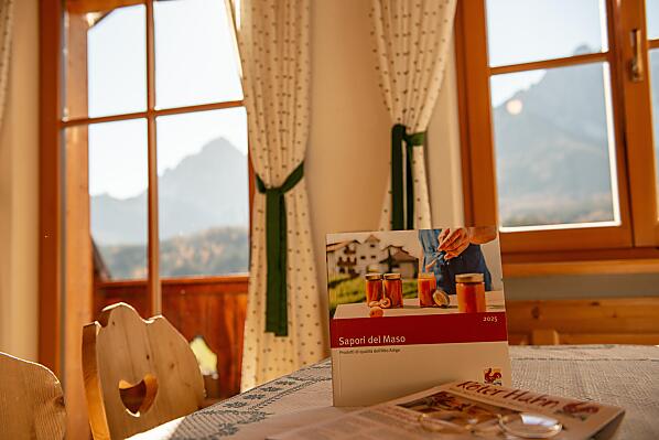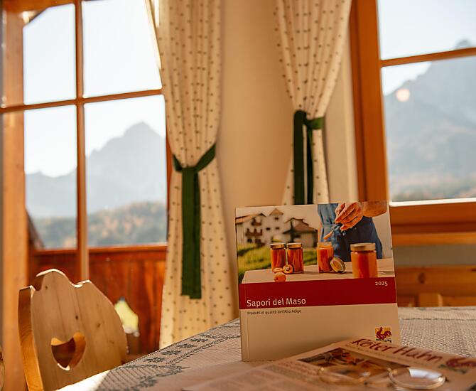 - Hofeigene Produkte beim Frühstück: Milch, Joghurt, Käse, Butter, Speck, Eier, Fruchtaufstriche, Sirup, Kräutertee, Brot, Backwaren, Frisches Gemüse je nach Saison, Frisches Obst je nach Saison