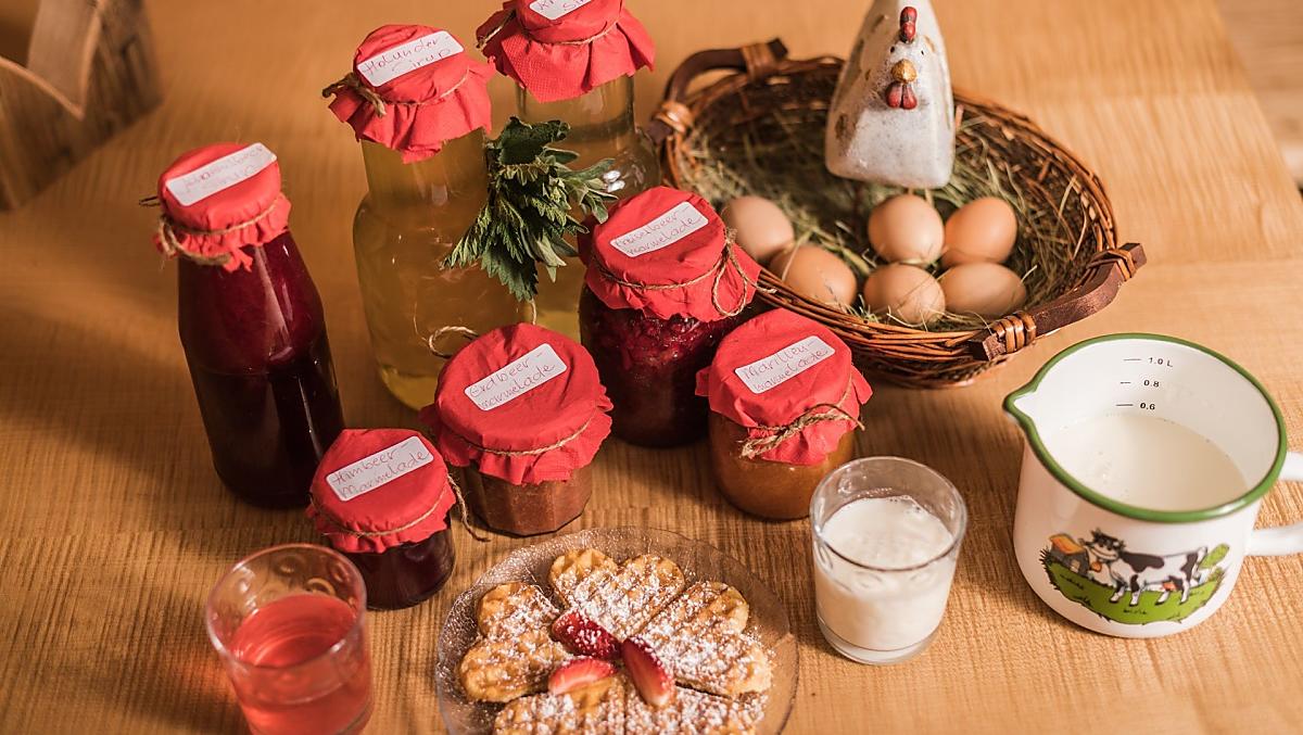 - Hofeigene Produkte beim Frühstück: Milch, Eier, Fruchtaufstriche, Sirup, Fruchtsäfte, Backwaren, Frisches Gemüse je nach Saison, Frisches Obst je nach Saison