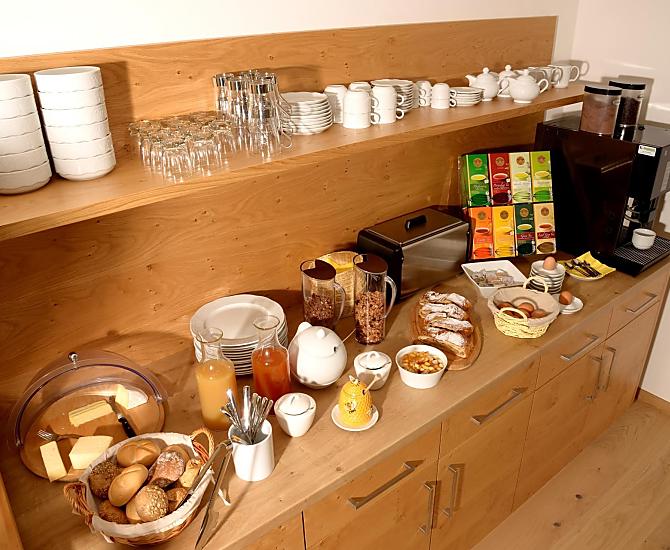 - Hofeigene Produkte beim Frühstück: Milch, Eier, Sirup, Fruchtsäfte, Trockenobst, Eingelegtes, Frisches Obst je nach Saison