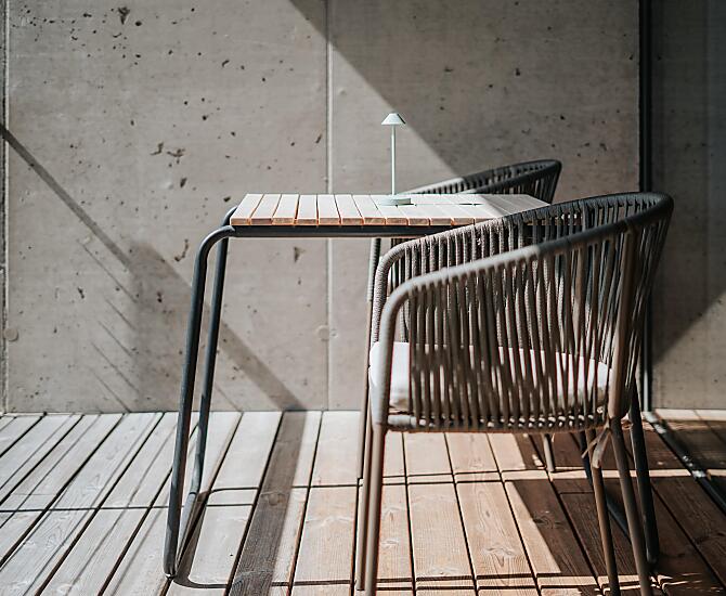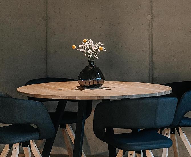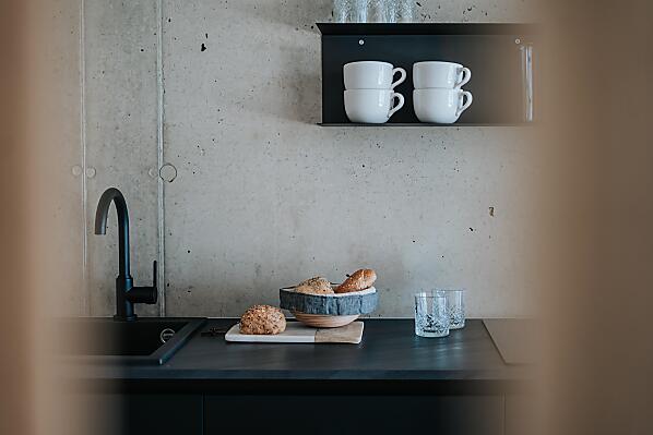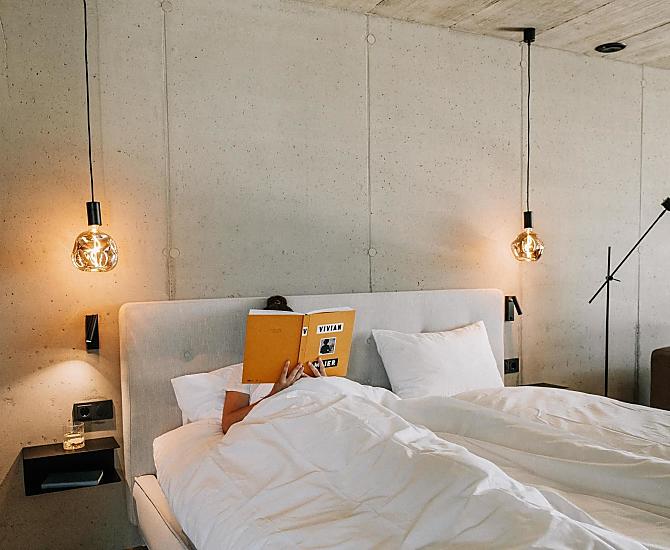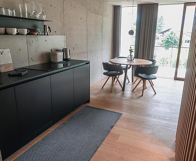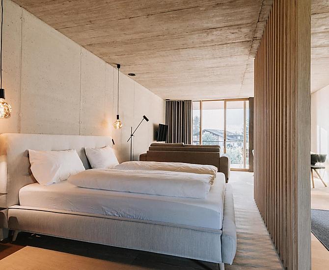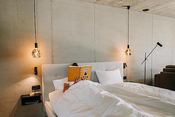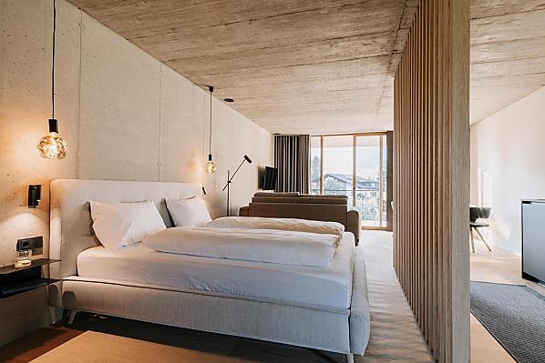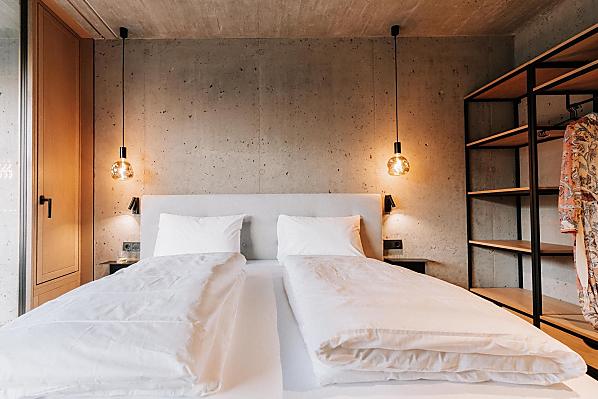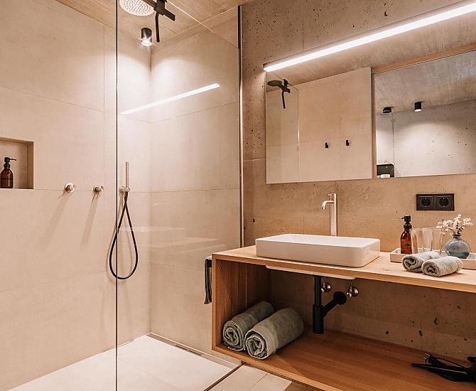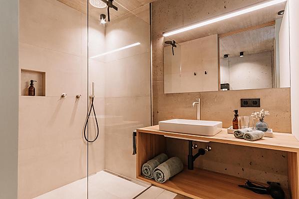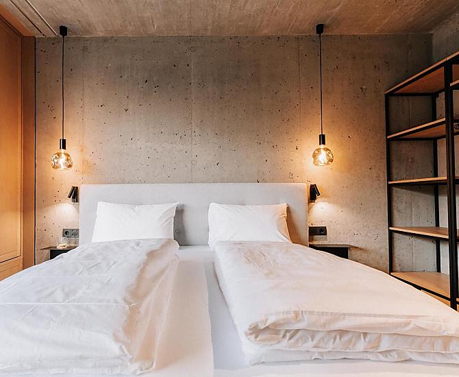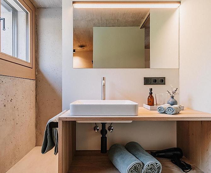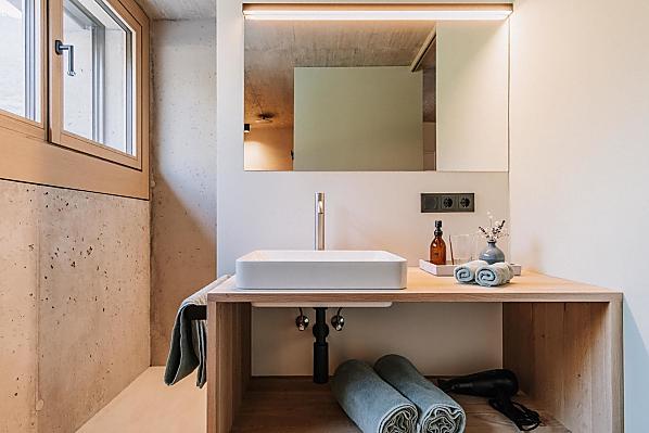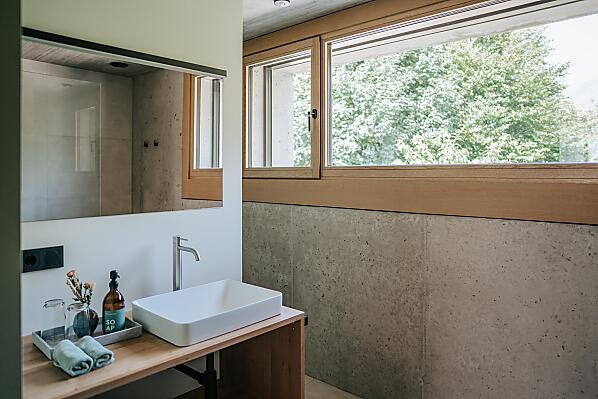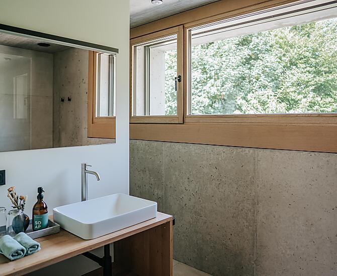 Wände aus Dämmbeton, naturbelassenes Holz, puristisch, reduziert auf das Wesentliche.