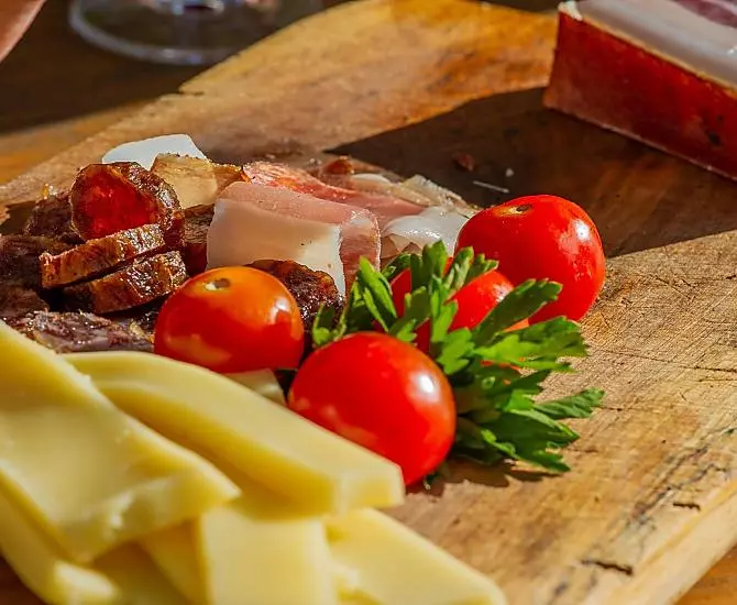 • Hofeigene Produkte beim Frühstück: Milch, Käse, Speck, Würste, Eier, Honig, Fruchtaufstriche, Sirup, Fruchtsäfte, Trockenobst, Gelees, Chutneys, Eingelegtes, Kräutertee, Kräutergewürze, Backwaren, Frisches Gemüse je nach Saison, Frisches Obst je nach Saison