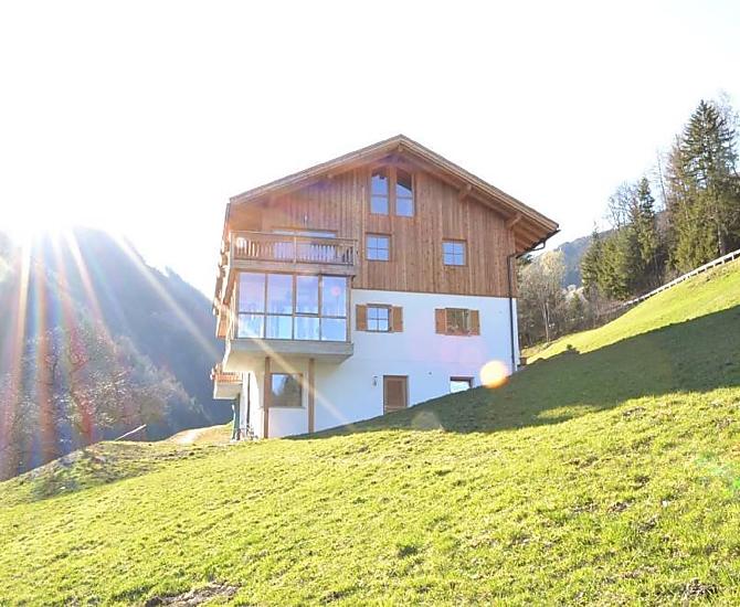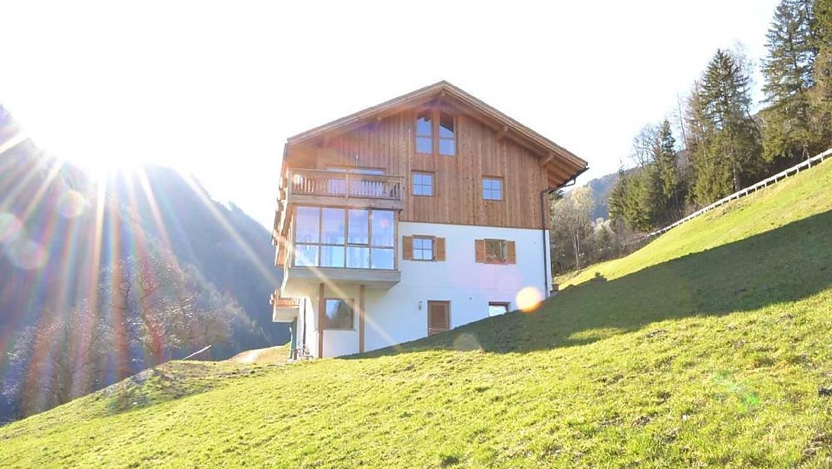 Kleiner idyllischer Bergbauernhof abseits von Verkehrslärm und Alltagshektik an einem sonnigen Hang.