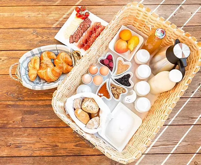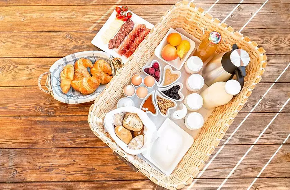 - Frühstück im Freien (je nach Saison), Frühstückskorb, Frühstückskorb mit biologischen Produkten