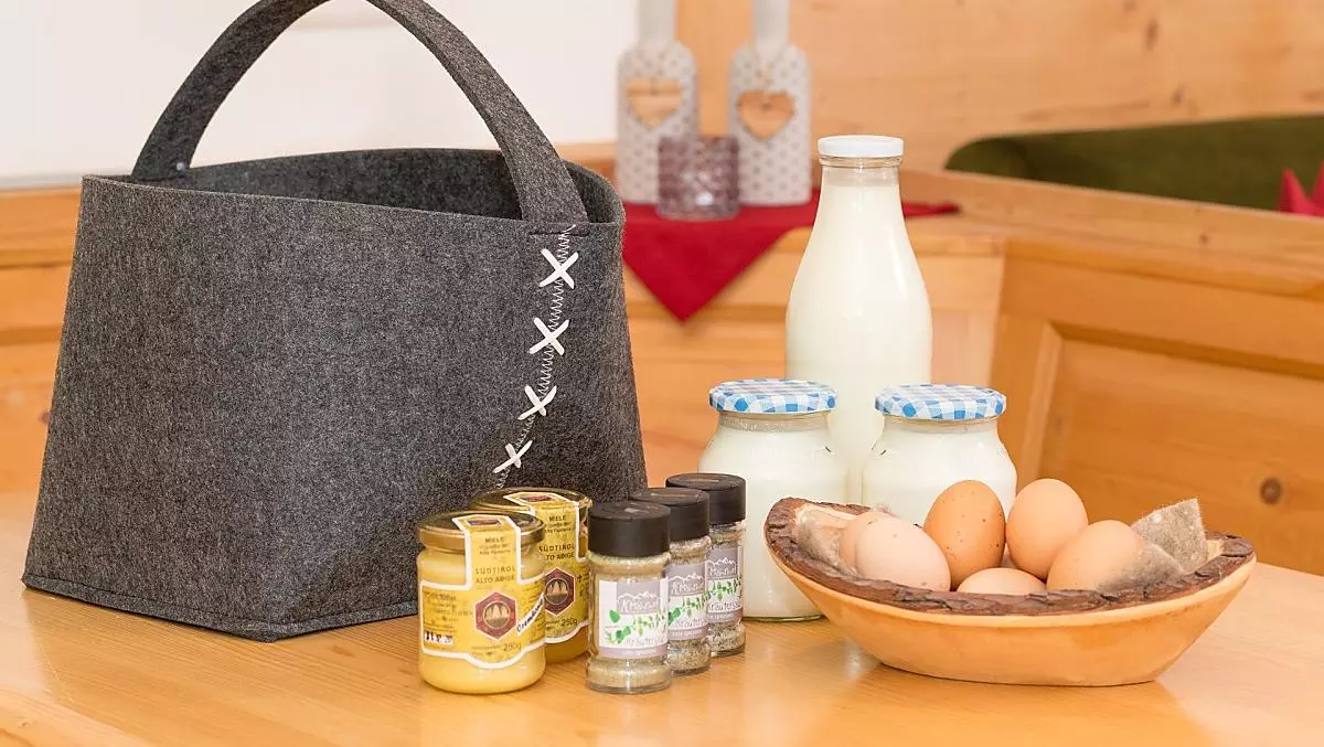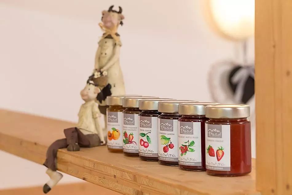 - Hofeigene Produkte beim Frühstück: Milch, Joghurt, Käse, Speck, Würste, Eier, Fruchtaufstriche, Sirup, Kräutertee, Kräutergewürze, Getreide, Backwaren, Frisches Gemüse je nach Saison, Frisches Obst je nach Saison