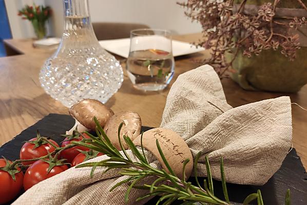 - Hofeigene Produkte beim Frühstück: Fruchtaufstriche, Sirup, Fruchtsäfte, Kräutertee, Kräutergewürze, Brot, Backwaren, Frisches Gemüse je nach Saison, Frisches Obst je nach Saison
