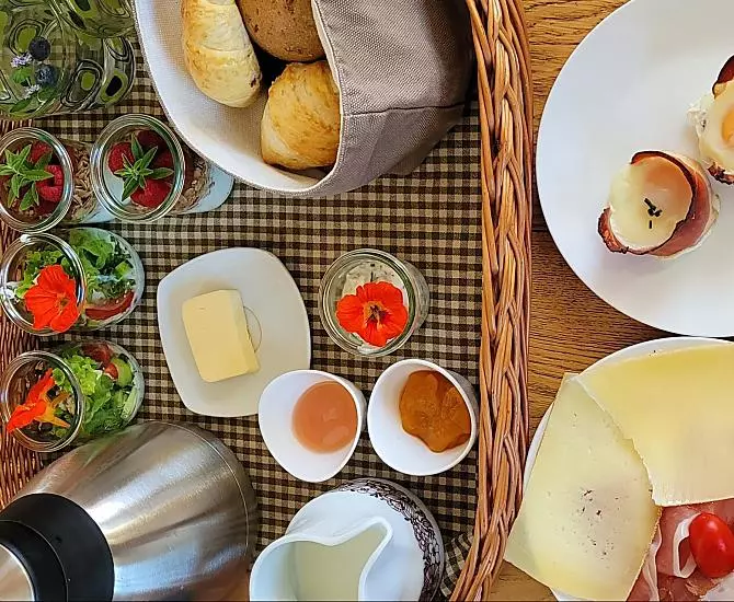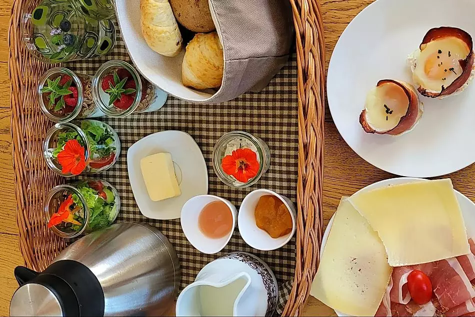 - Hofeigene Produkte beim Frühstück: Speck, Eier, Fruchtaufstriche, Sirup, Gelees, Eingelegtes, Kräutergewürze, Brot, Getreide, Backwaren, Frisches Gemüse je nach Saison, Frisches Obst je nach Saison