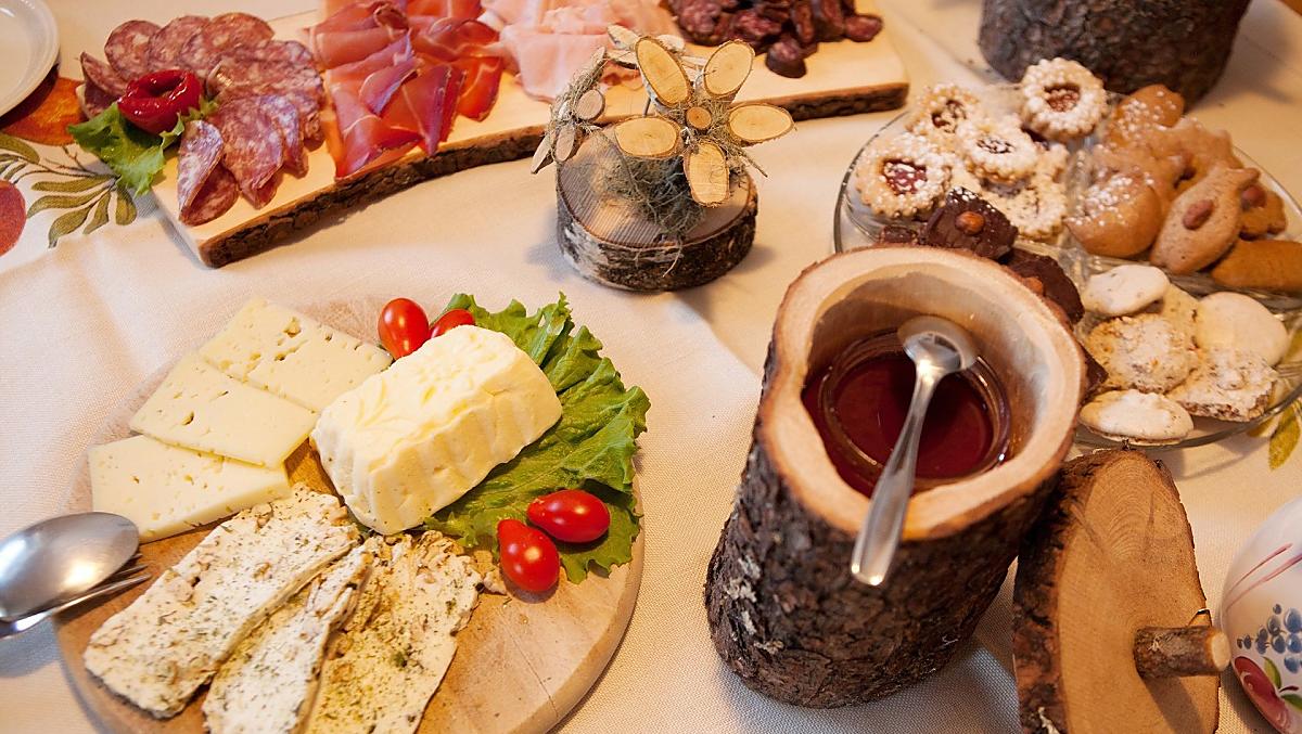 - Hofeigene Produkte beim Frühstück: Milch, Joghurt, Käse, Andere Milchprodukte, Speck, Geselchtes Rindfleisch, Würste, Eier, Honig, Fruchtaufstriche, Sirup, Fruchtsäfte, Trockenobst, Gelees, Chutneys, Eingelegtes, Kräutertee, Kräutergewürze, Brot, Getreide, Backwaren, Frisches Gemüse je nach Saison, Frisches Obst je nach Saison