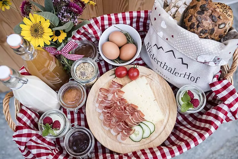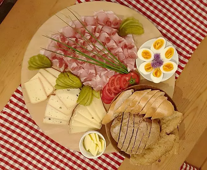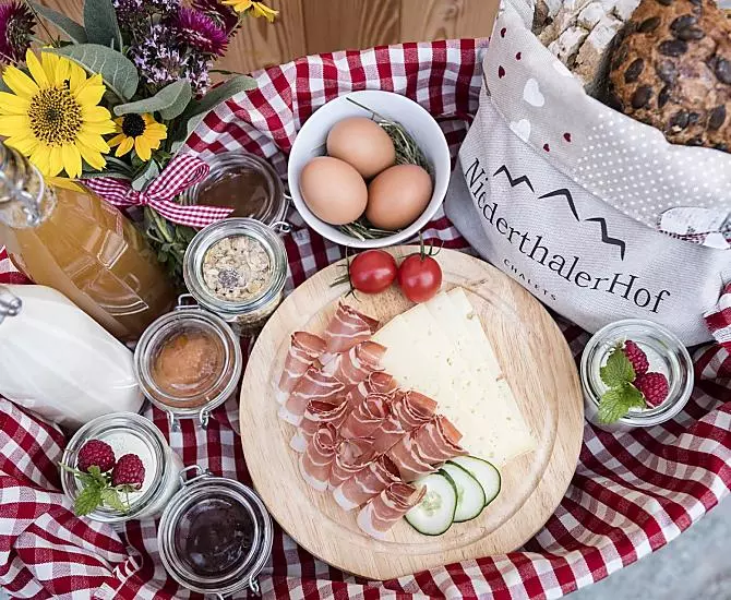 - Hofeigene Produkte beim Frühstück: Speck, Eier, Fruchtaufstriche, Sirup, Backwaren