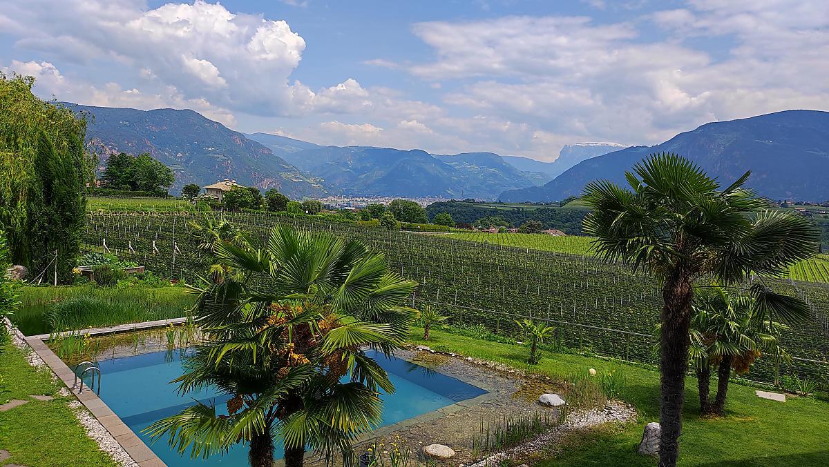 Der Oberberghof, der 2012 neu errichtet worden ist, befindet sich inmitten von Weinbergen in der schönen Gemeinde Eppan, oberhalb des Weindorfes St. Pauls, direkt an der Südtiroler Weinstraße – ganz in der Nähe von Bozen, des Kalterer Sees und einer Vielzahl an Ausflugszielen. Besonders beliebt sind bei unseren Gästen der Bio-Schwimmteich, die hervorragende und ruhige Lage und der Panoramablick über die Südtiroler Weinstraße. Die Wertschätzung unserer Gastfreundlichkeit ehrt uns ganz besonders. Beide Ferienwohnungen sind ca. 45 m² groß und für 2 bis 4 Personen geeignet. Zur Ferienwohnung Schlern, die sich ebenerdig befindet, gehört ein kleiner Garten, zur Ferienwohnung Latemar, die sich im ersten Stock befindet, gehört eine große Terrasse. Die Aussicht von beiden Ferienwohnungen ist atemberaubend – vom Rittner Horn im Norden über den Schlern – dem Wahrzeichen Südtirols – Latemar, Zanggen, Weiß- und Schwarzhorn bis zu den Fleimstaler Alpen im Süden.