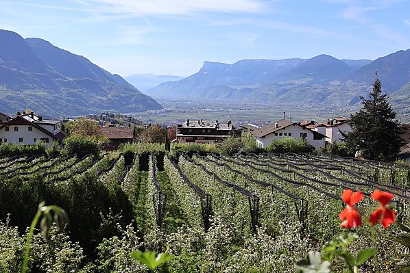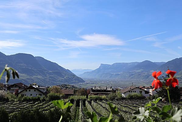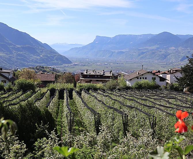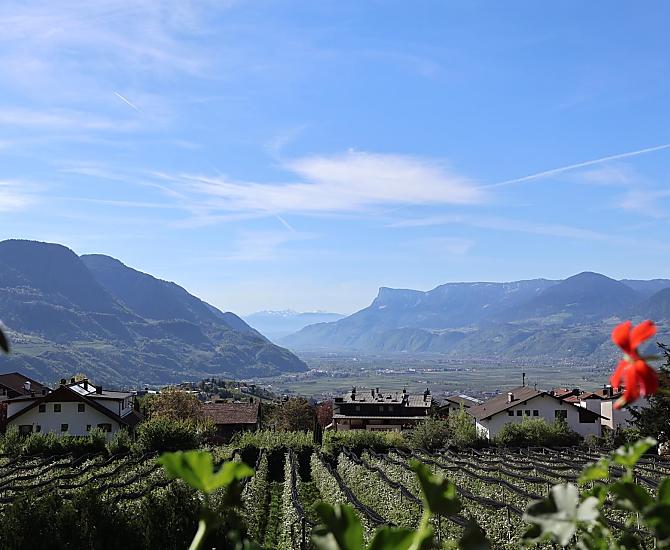 Unser Bauernhof liegt ruhig und doch zentral inmitten der Obstwiesen mit herrlichem Blick ins Etschtal.