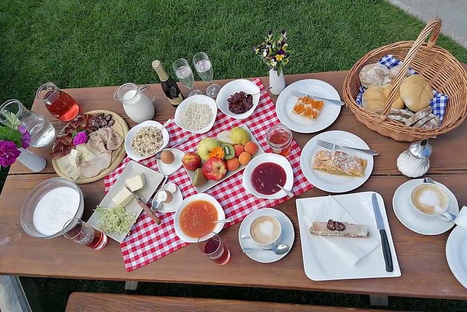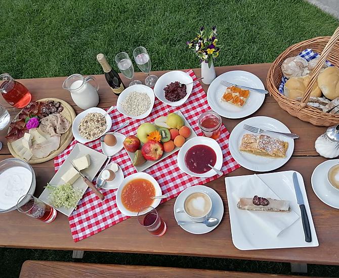 - Frühstück im Aufenthaltsraum, Frühstück in der Bauernstube, Frühstück im Freien (je nach Saison), Frühstücksbuffet, Frühstückskorb, Frühstück mit biologischen Produkten
