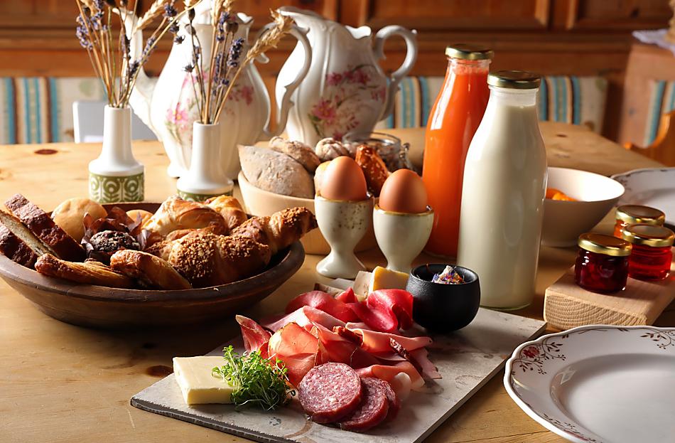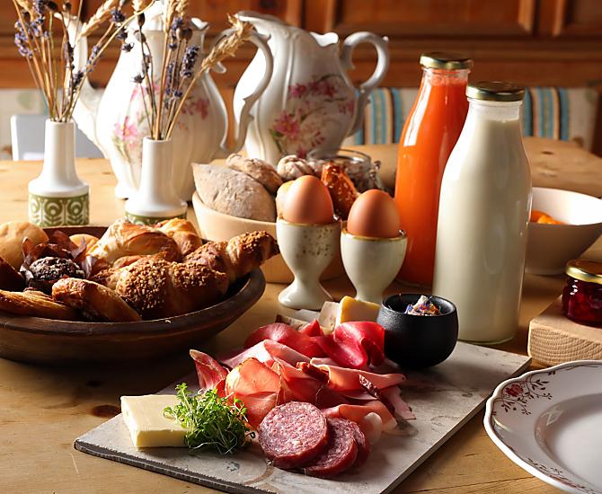- Hofeigene Produkte beim Frühstück: Milch, Joghurt, Käse, Speck, Würste, Honig, Fruchtaufstriche, Sirup, Eingelegtes, Kräutertee, Kräutergewürze, Brot, Backwaren, Frisches Gemüse je nach Saison, Frisches Obst je nach Saison